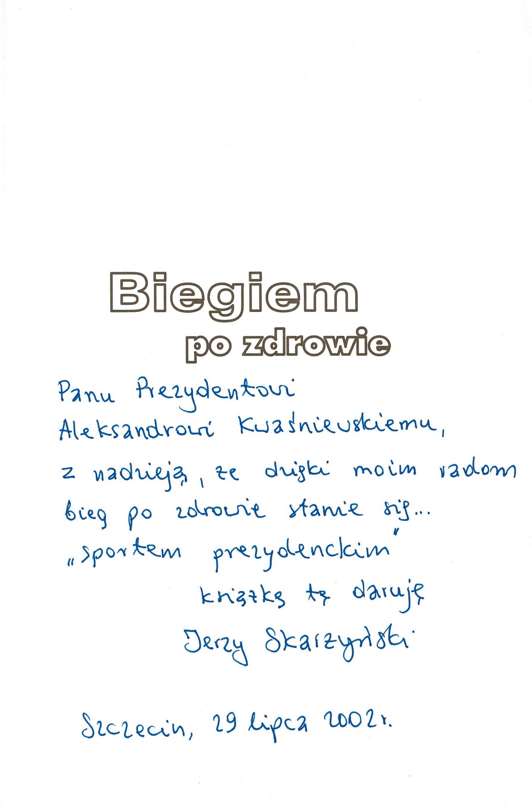 Treść dedykacji: Panu Prezydentowi Aleksandrowi Kwaśniewskiemu, z nadzieją, że dzięki moim radom bieg po zdrowie stanie sie... "sportem prezydenckim" książkę tę daruję Jerzy Skarżyński Szczecin, 29 lipca 2002 r.