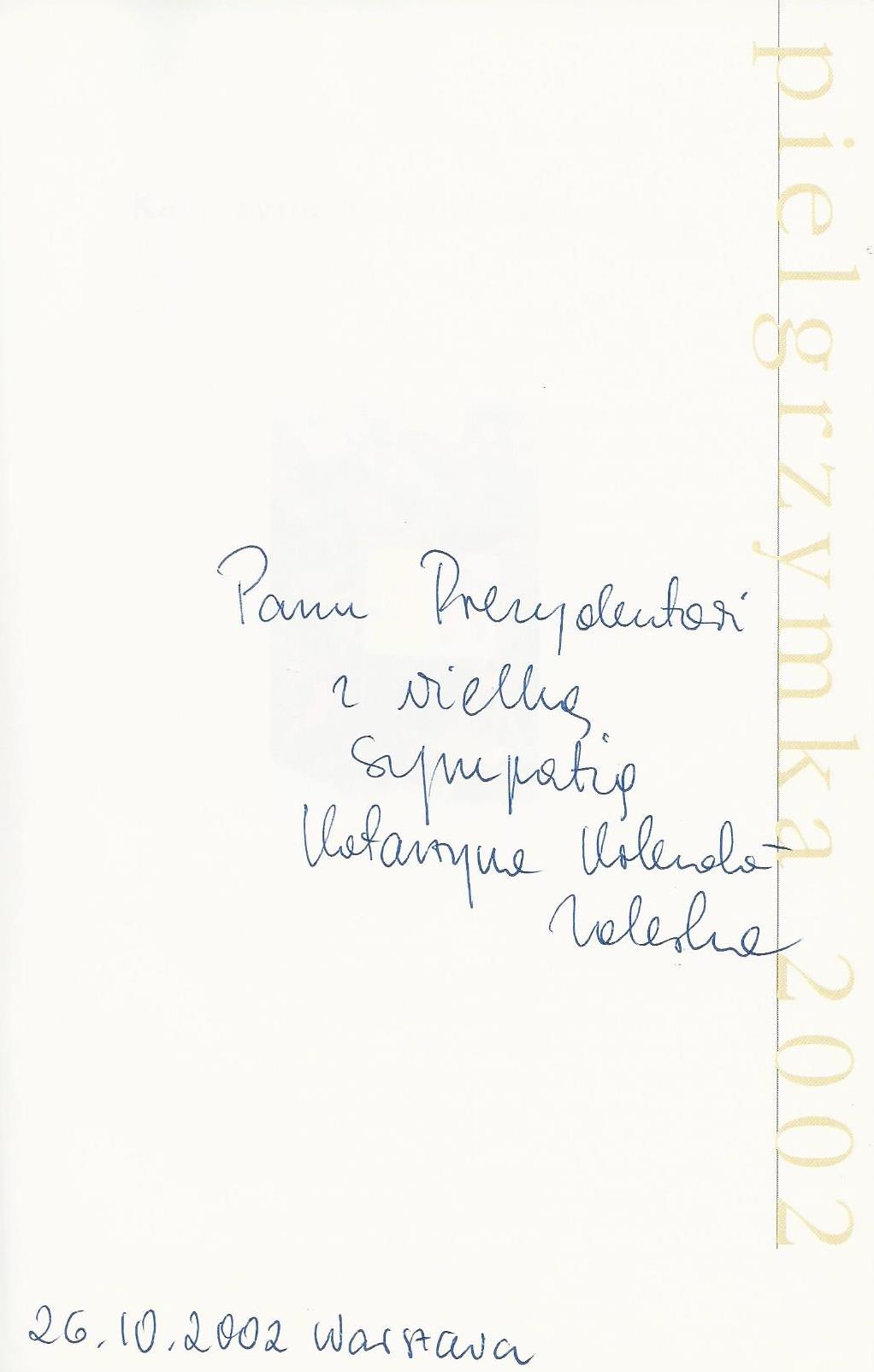 Treść dedykacji: Panu Prezydentowi z wielką sympatią Katarzyna Kolenda- Zalewska 26.10.2002 Warszawa