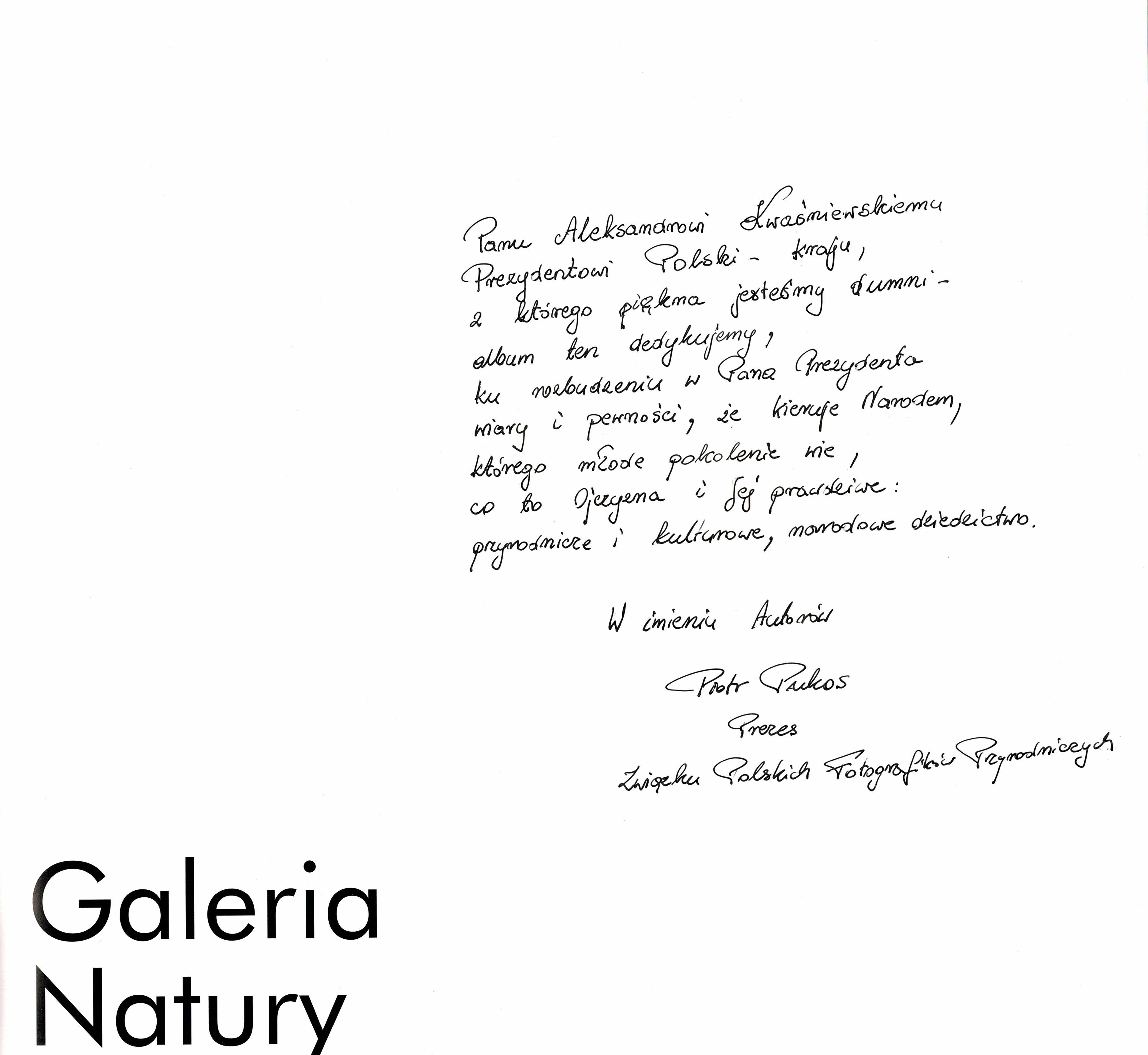 Treść dedykacji: Panu Aleksandrowi Kwaśniewskiemu Prezydentowi Polski - kraju, z którego piękna jesteśmy dumni- album ten dedykujemy, ku rozbudzeniu w Pana Prezydenta wiary i pewności, że kieruje Narodem, którego młode pokolenie wie, co to Ojczyzna i Jej prawdziwe, przyrodnicze i kulturowe, narodowe dziedzictwo