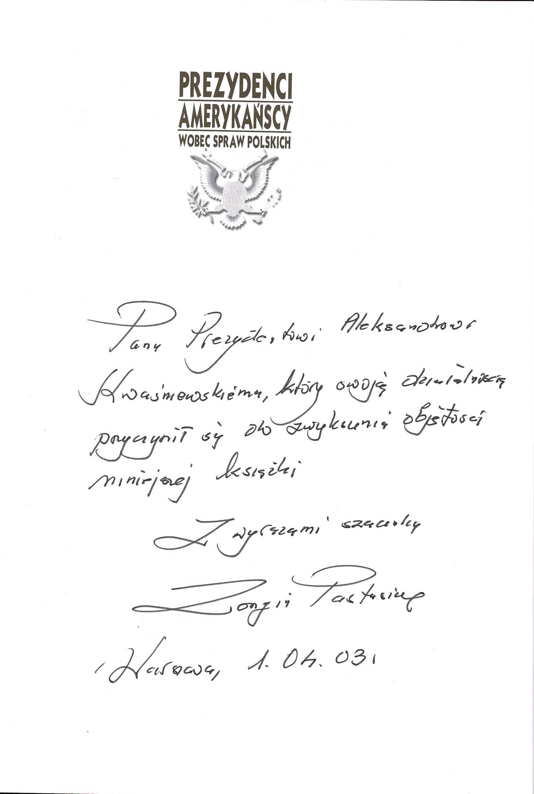 Treść dedykacji: Panu Prezydentowi Aleksandrowi Kwaśniewskiemu, który swoją działalnością przyczynił się do zwiększenia objętości ninejszej ksiażki. Z wyrazami szacunku Longin Pastusiak, warszawa 1.04.03.