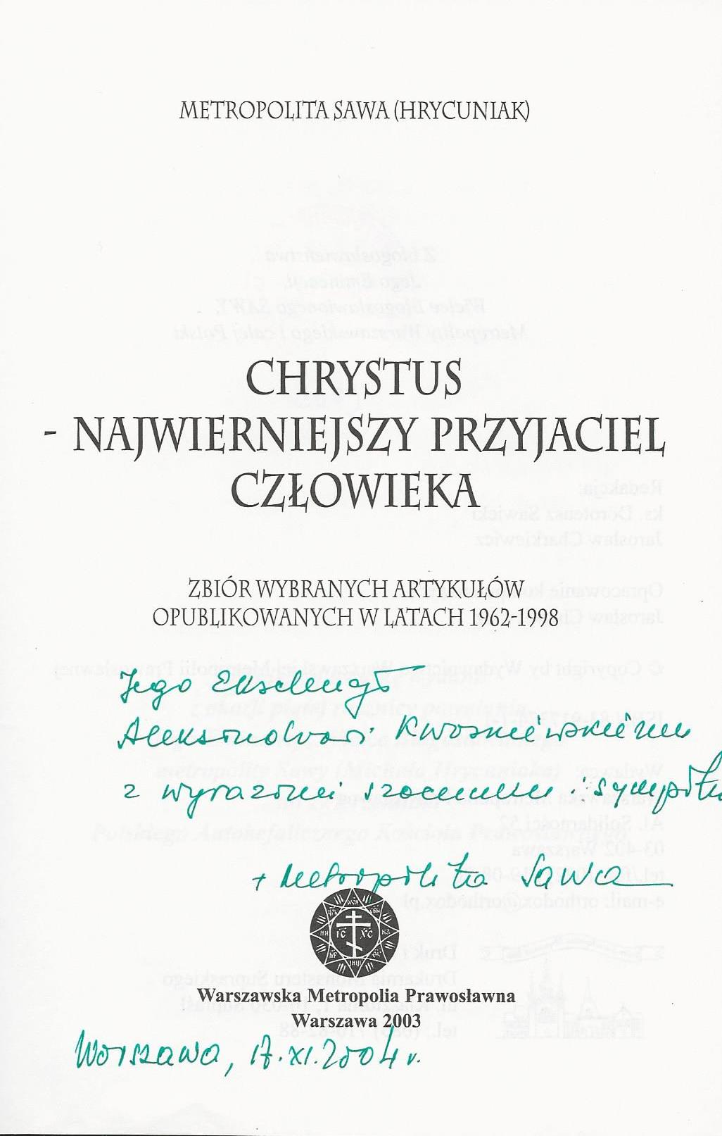 Treść dedykacji: Jego Ekscelencji Aleksandrowi Kwaśniewskiemu z wyrazami szacunku Sowa Warszawa, 17.Xi.2004 r.