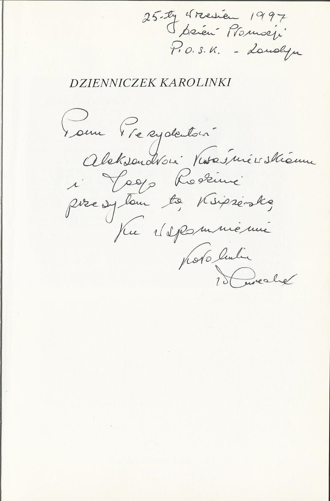 Treść dedykacji: Panu Prezydentowi Aleksandrowi Kwaśniewskiemu i Jego Rodzinie przesyłam tą Książkę ku przestrodze Karolina Bilińska