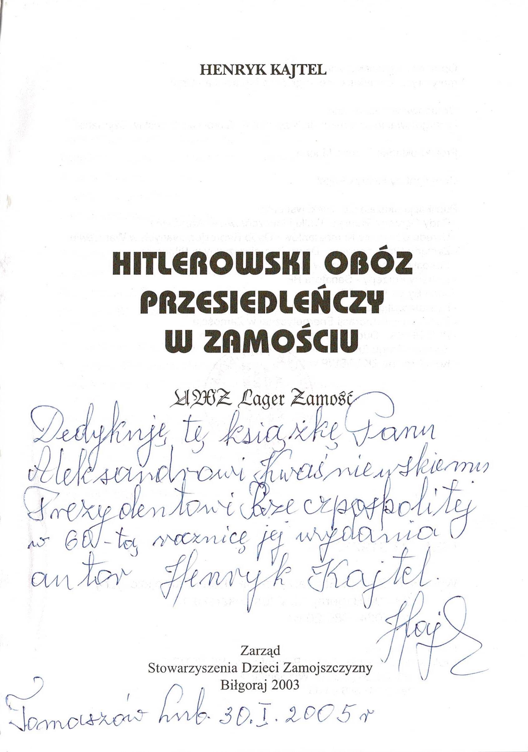 Treść dedykacji: Dedykuję tę książkę Panu Aleksandrowi Kwaśniewskiemu Prezydentowi Rzeczpospolitej w 60-tą rocznicę jej wydania autor Henryk Kajtel. Kajtel. Tomasszó Lub. 30.I. 2005 r.