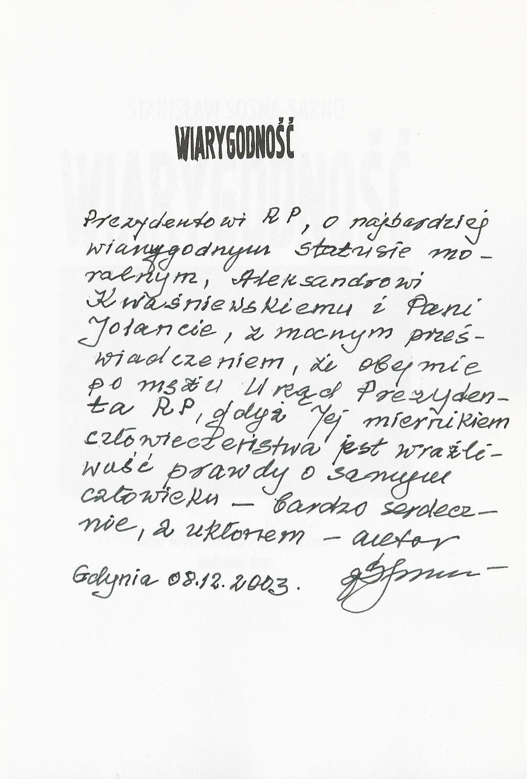 Treść dedykacji: Prezydentowi RP, o najbardziej wiarygodnym statusie moralnym, Aleksandrowi Kwaśniewskiemu i Pani Jolancie, z mocnym przeświadczeniem, że obejmie po myśli Urząd Prezydenta RP, gdyż Jej miernikiem człowieczeństwa jest wrażliwość prawdy o samym człowieku - bardzo serdecznie, z ukłonem - autor Gdynia 08.12.2003 S.Sosna-Sarno