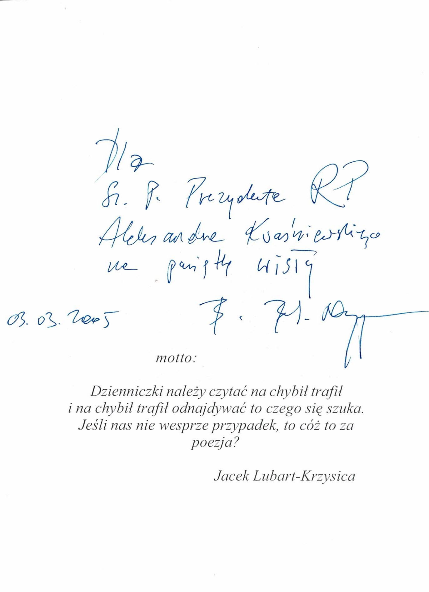Treść dedykacji: Dla Sz.P. Prezydenta RP Aleksandra Kwaśniewskiego na pamiątkę Wisły