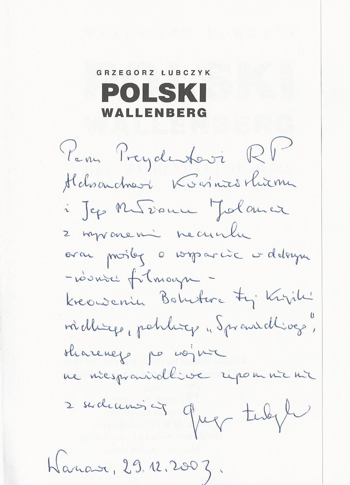 Treść dedykacji: Panu Prezydentowi RP Aleksandrowi Kwaśniewskiemu i Jego Małżonce Jolancie z wyrazami szacunku oraz prośbą o wsparcie w dalszych - również kreowaniu Bohatera tej książki wielkiego ( dalsza część dedykacji jest nieczytelna) Grzeg Łubczyk Warszawa, 29.12.2013
