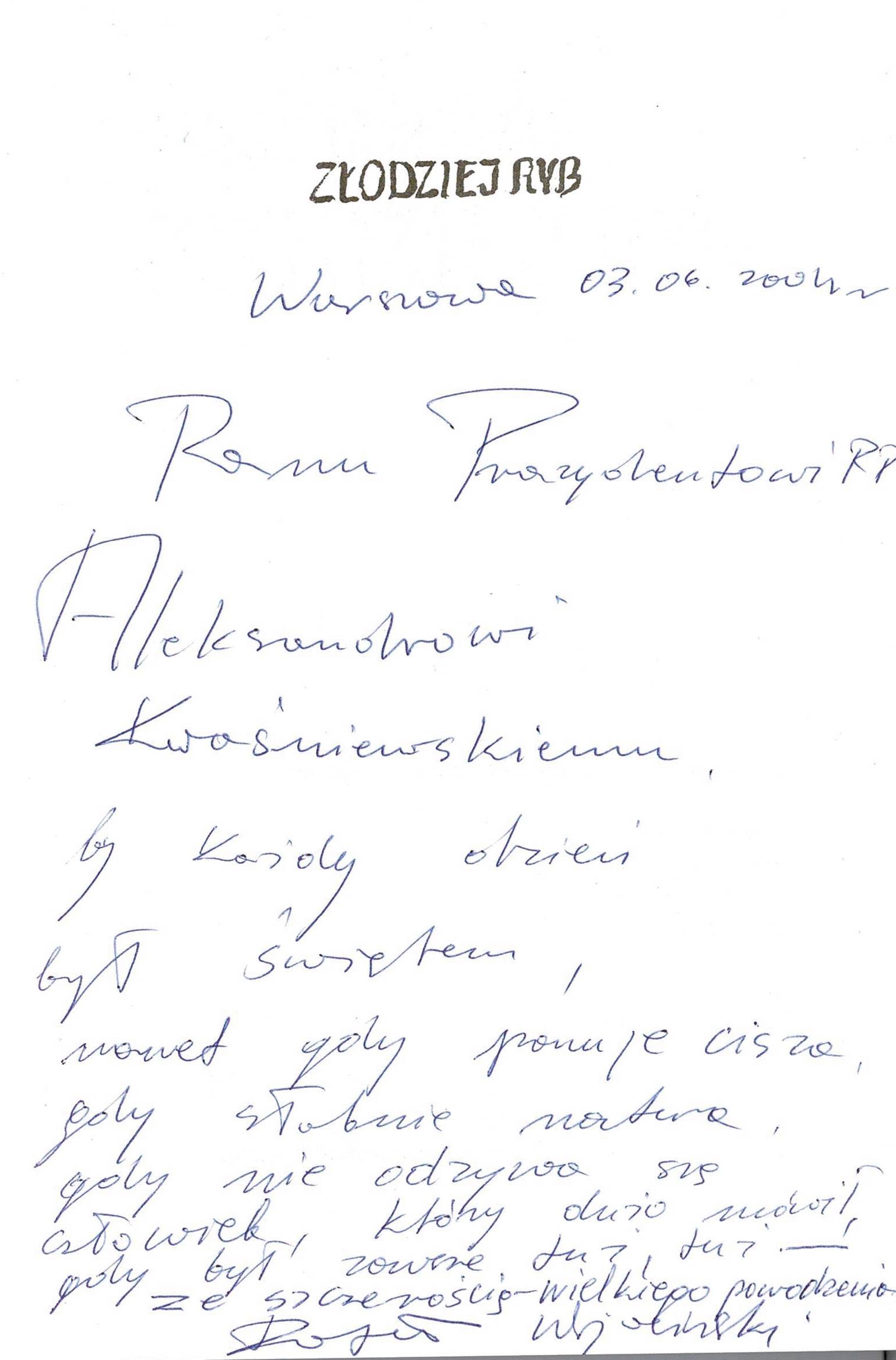 Treść dedykacji: Panu Prezydentowi Aleksandrowi Kwaśniewskiemu by każdy dzień był światłem, nawet gdy panuje cisza, gdy słabnie natura, gdy nie odzywa się człowiek, który dużo mówił, gdy był zawsze tuż tuż ze szczerością wielkiego powodzenia Rafał Wojasiński
