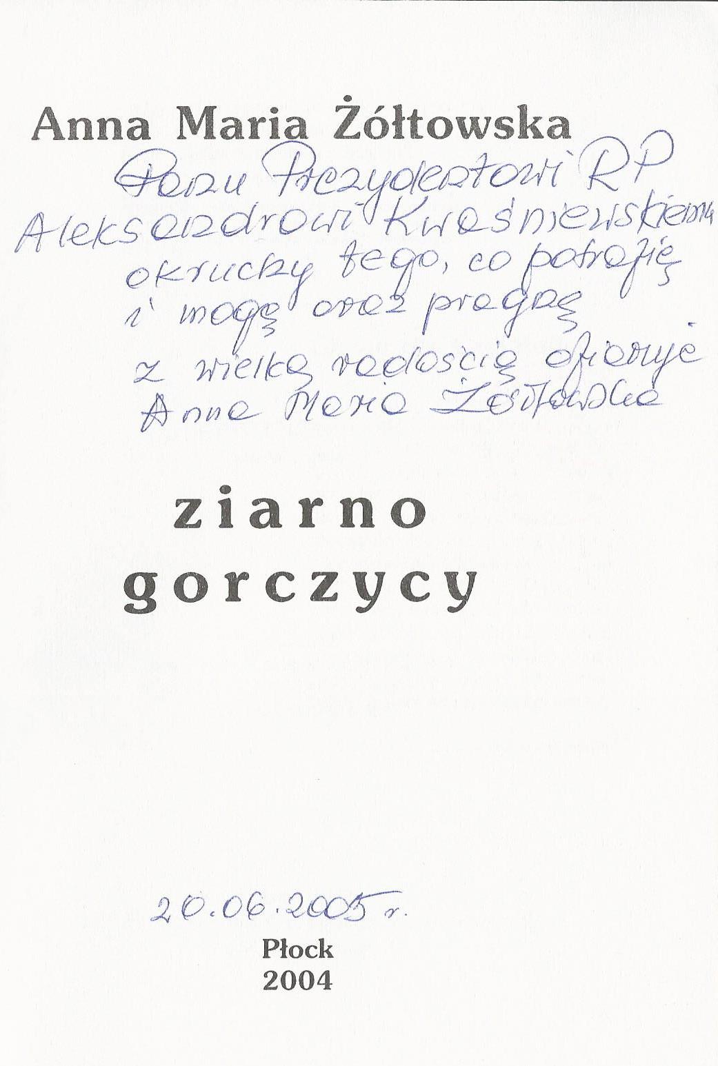 Treść dedykacji: Panu Prezydentowi RP Aleksandrowi Kwaśniewskiemu okruchy tego, co potrafię i mogę oraz pragnę z wielką radością ofiaruje Anna Maria Żółtkowska 20.06.2005r.