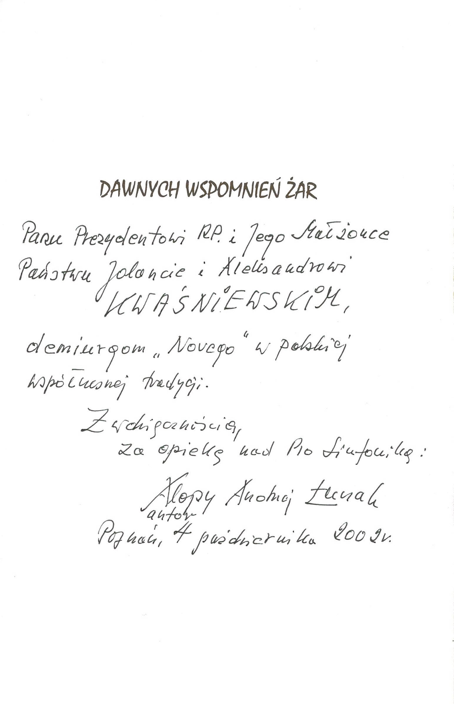 Treść dedykacji: Panu Prezydentowi RP i Jego Małżonce Państwu Jolancie i Aleksandrowi Kwaśniewskim, demiurgom "Novego" w polskiej współczesnej tradycji. Z wdzięcznością za opiekę nad (nieczytelne): Alojzy Andrzej Łuczak autor Poznań, 4 października 2002 r.