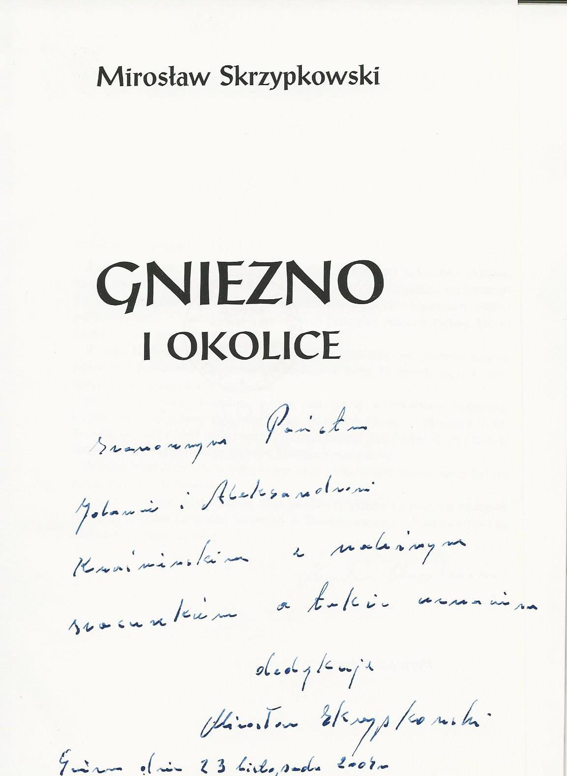 Treść dedykacji: Szanownym Państwu Jolancie i Aleksandrowi Kwaśniewskim z należnym szacunkiem dedykuje Mirosław Skrzypkowski Gniezno dnia 23 listopada 2004r.