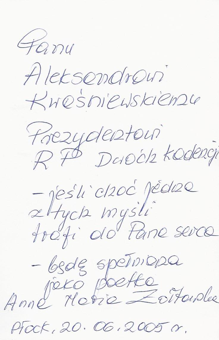Treść dedykacji: Panu Aleksandrowi Kwaśniewskiemu Prezydentowi RP Dwóch kadencji - jeśli choć jedna z tych myśli trafi do Pana serca - będę spełniona jako poetka Anna Maria Żółtowska Płock, 20.06.2005 r.