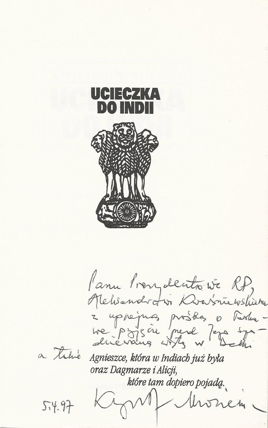 Treść dedykacji: Panu Prezydentowi RP, Aleksandrowi Kwasniewskiemu z uprzejmą prosbą o łaskawe perzyjęcie prezed Jego spodziewaną wistytą w Felhi a także Agnieszce, która w Indiach już była oraz Dagmarze i Alicji, które tam dopiero pojadą. 5.4.97 Krzysztof Mroziewicz