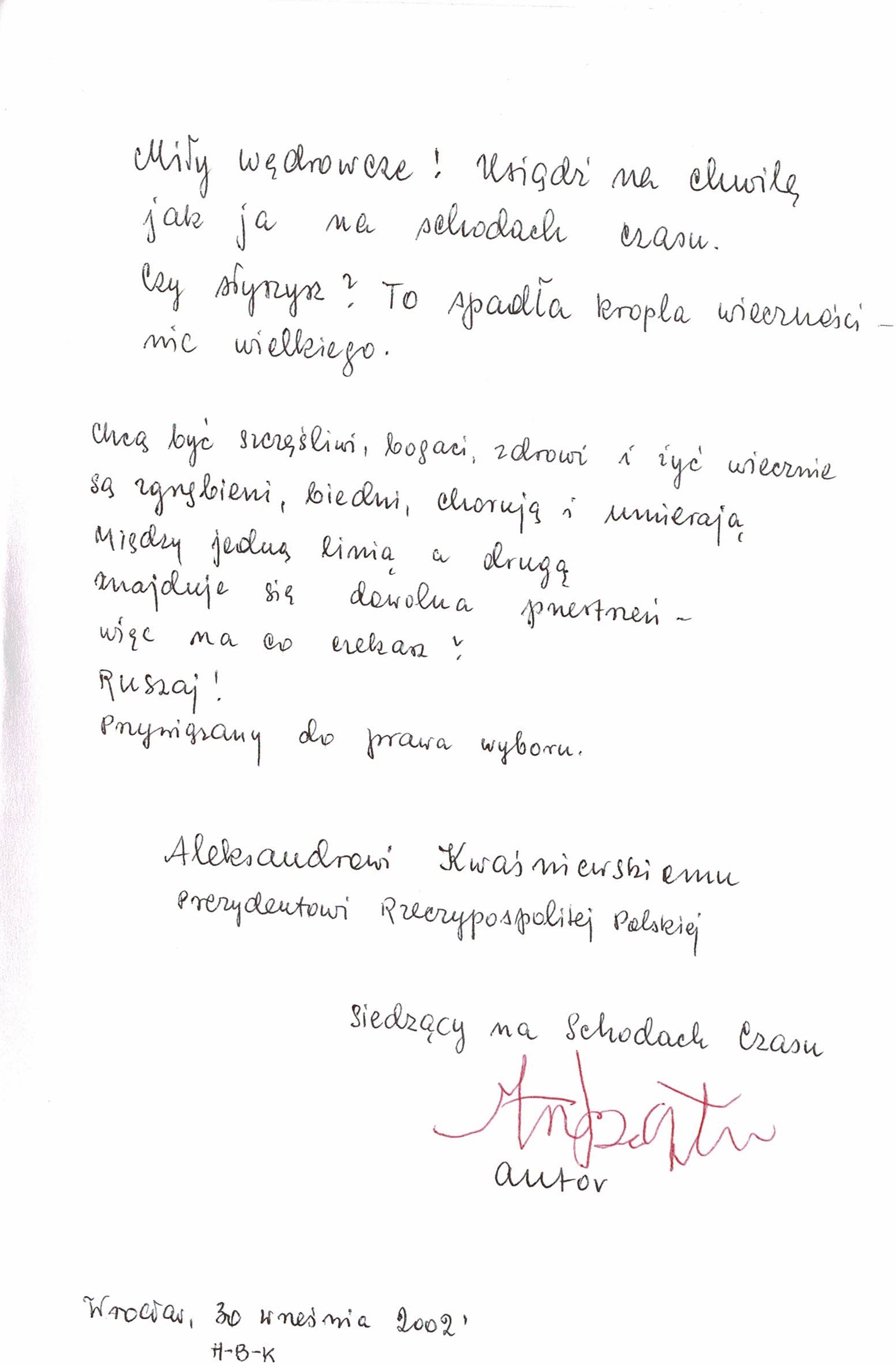 Treść dedykacji:Miły wędrowcze! Usiądź na chwilę jak ja na schodach czasu. Czy słyszysz? To spadła kropla wieczności- nic wielkiego. Chcą być szczęśliwi, bogaci, zdrowi i żyć wiecznie, są zgubieni, biedni, chorują i umierają. Między jedną linią a drugą znajduje się dowolona przestrzeń - więc na co czekasz? Ruszaj! Przywiązany do prawa wyboru. Aleksandrowi Kwaśniewskiemu Prezydentowi Rzeczypospolitej Polskiej Siedzący na schodach czasu Andrzej Bartyński, autor. Wrocław, 30 września 2002 H-B-K