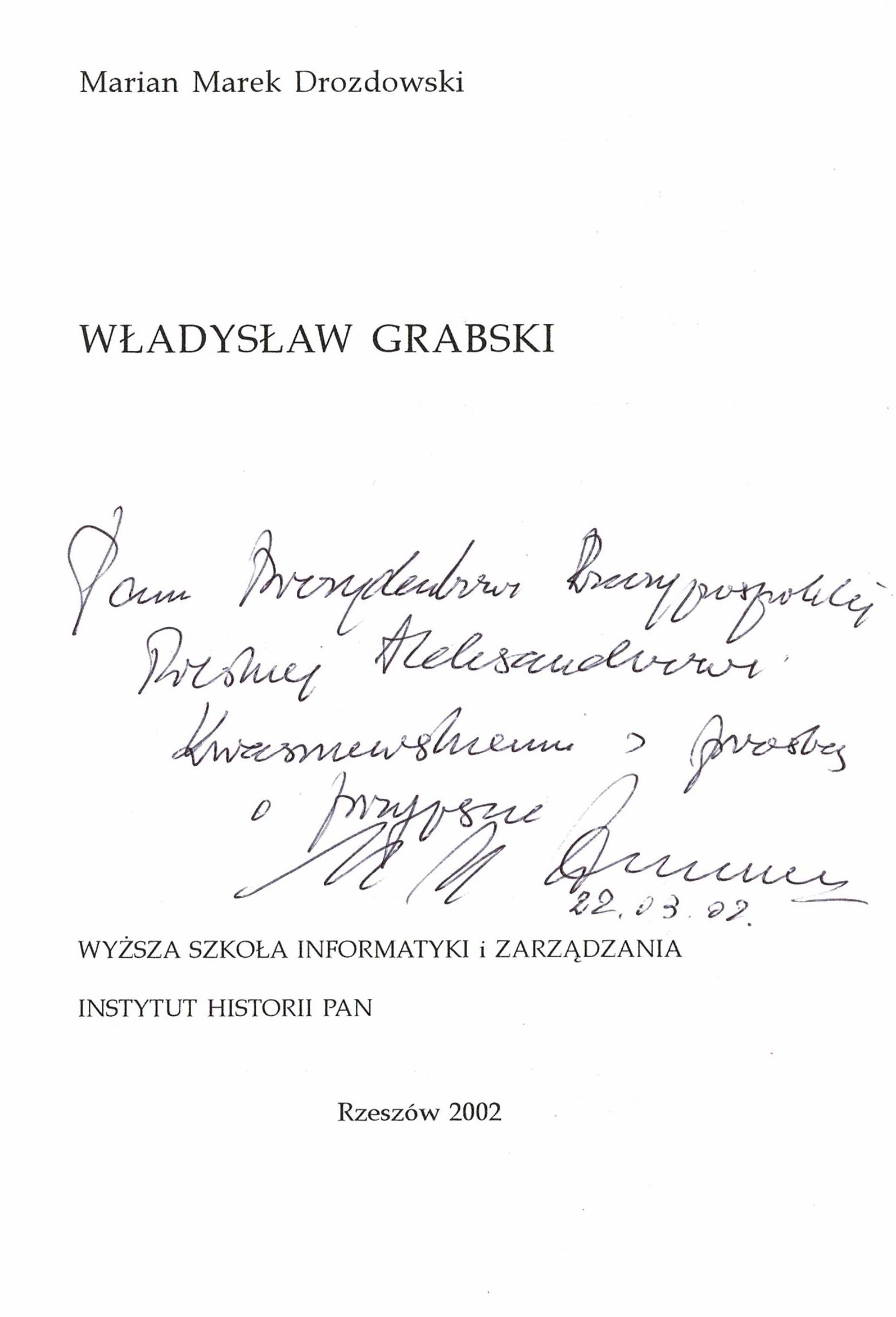 Treść dedykacji: Panu Prezydentowi Rzeczypospolitej Polskiej Aleksandrowi Kwaśniewskiemu z prośbą o przyjęcie Marian Marek Drozdowski