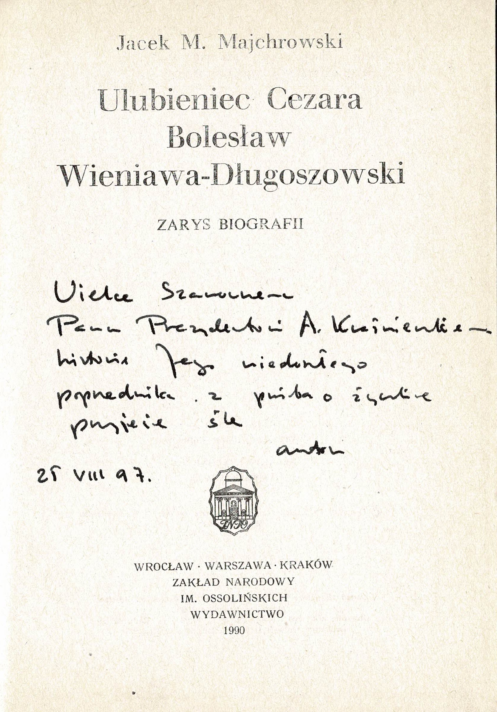 Treść dedykacji: Wielce Szanownemu Panu Prezydentowi Aleksandrowi Kwaśniewskiemu - historii Jego wielkiego poprzednika, z prośbą o życzliwe przyjęcie śle autor
