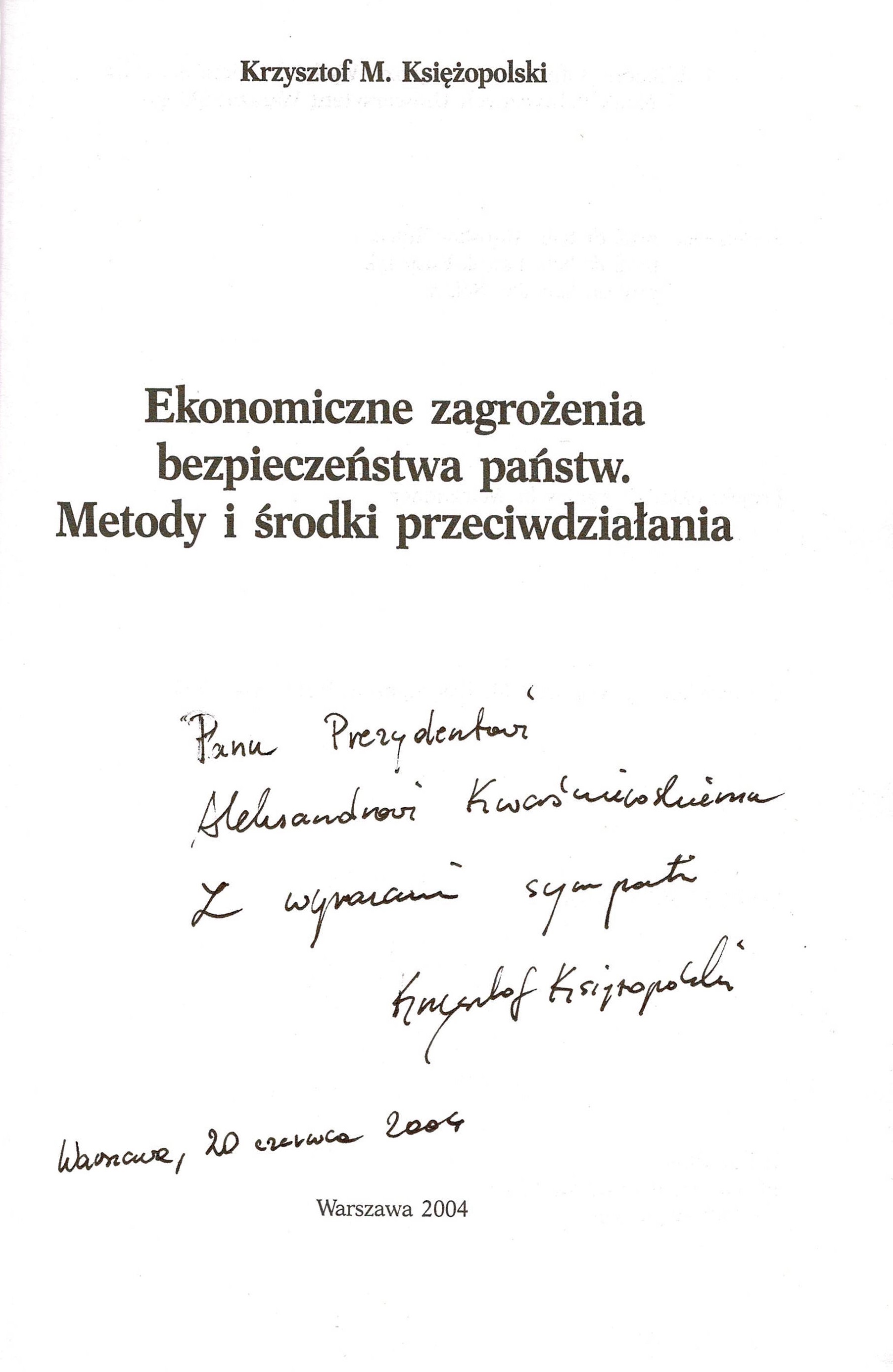 Treść dedykacji: Panu Prezydentowi Aleksandrowi Kwaśniewskiemu z wyrazami sympatii Krzysztof Księżopolski Warszawa, 20 czerwca 2004.