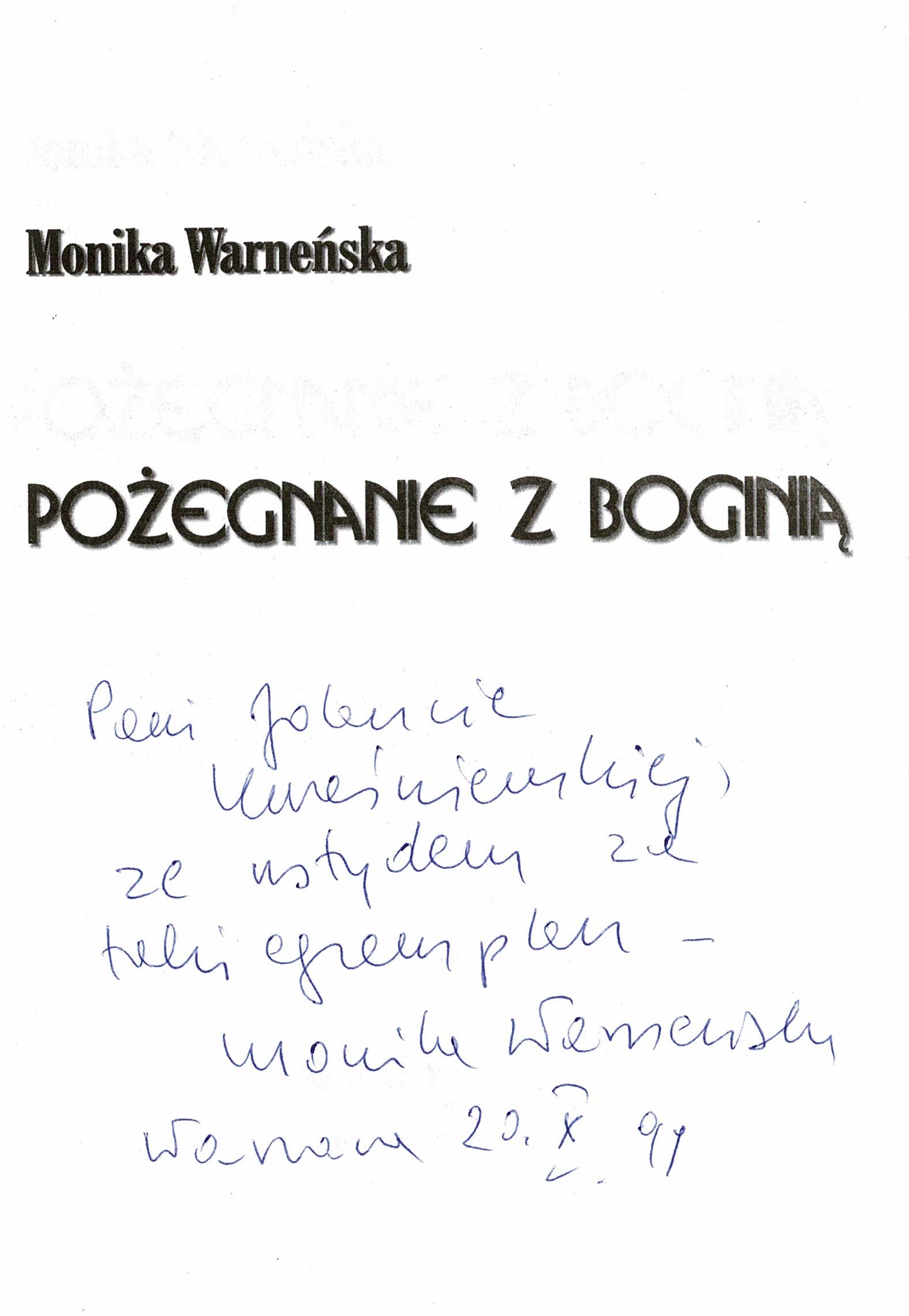 Treść dedykacji: Pani Jolancie Kwaśniewskiej ze wstydem za taki egzemplarz - Monika Warneńska