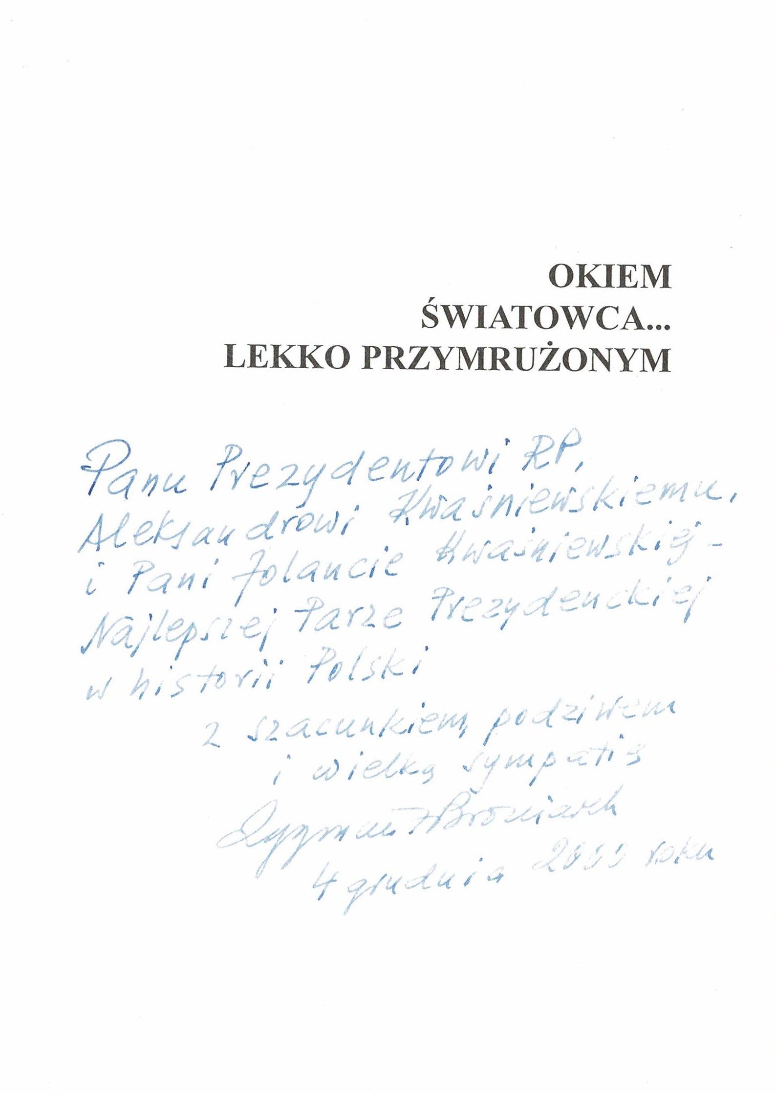 Treść dedykacji: Panu Prezydentowi RP , Aleksandrowi Kwaśniewskiemu i Pani Jolancie Kwaśniewskiej - Najlepszej Parze Prezydenckiej w historii Polski. Z szacunkiem, podziwem i wielką sympatią Zygmint Broniarek. 4 grudnia 2000 roku