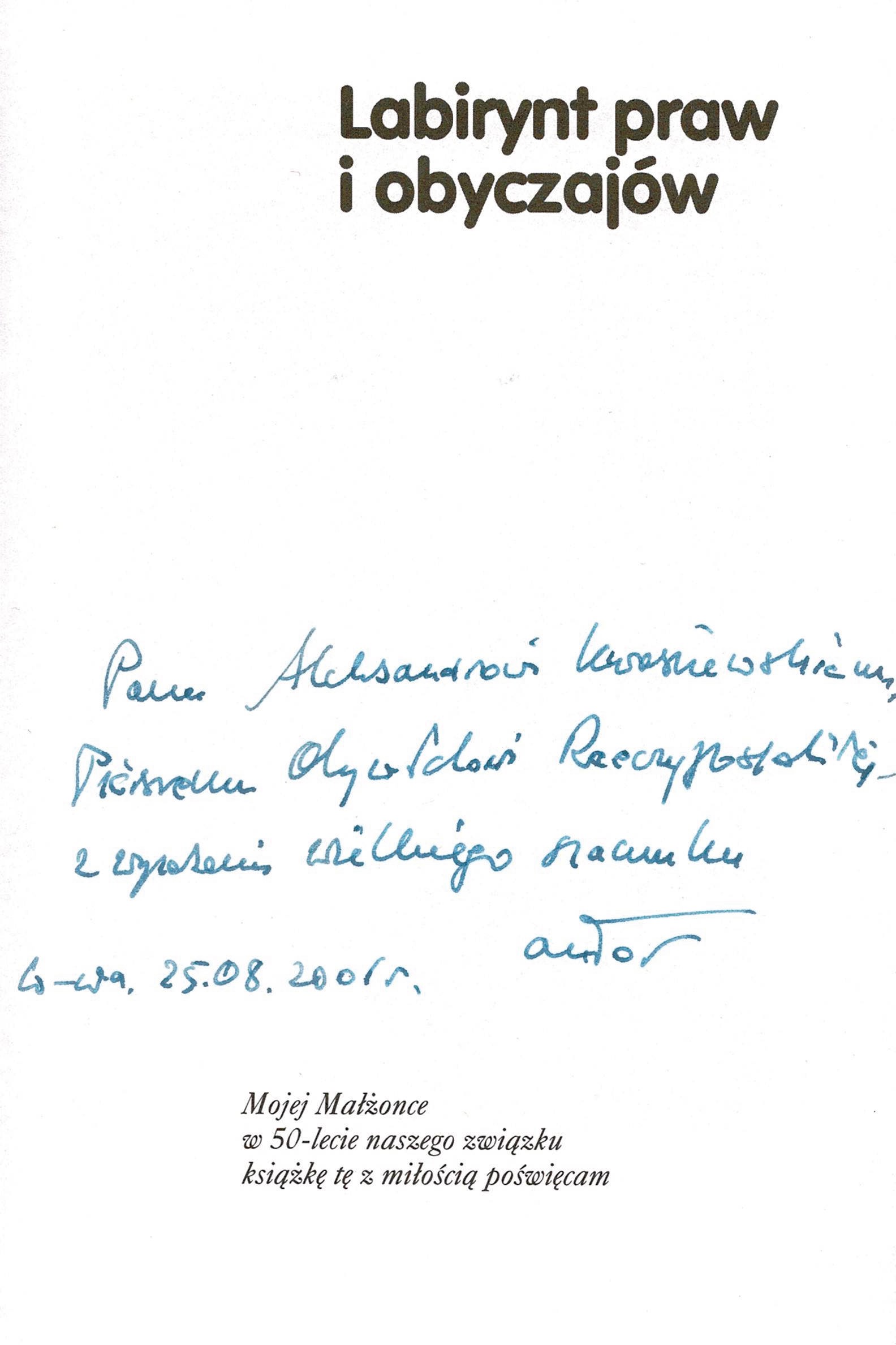 Treść dedykacji: Panu Aleksandrowi Kwaśniewskiemu, Pierwszemu Obywatelowi Rzeczypospolitej, z wyrazami wielkiego szacunku autor W-wa, 25.08.2001 r.