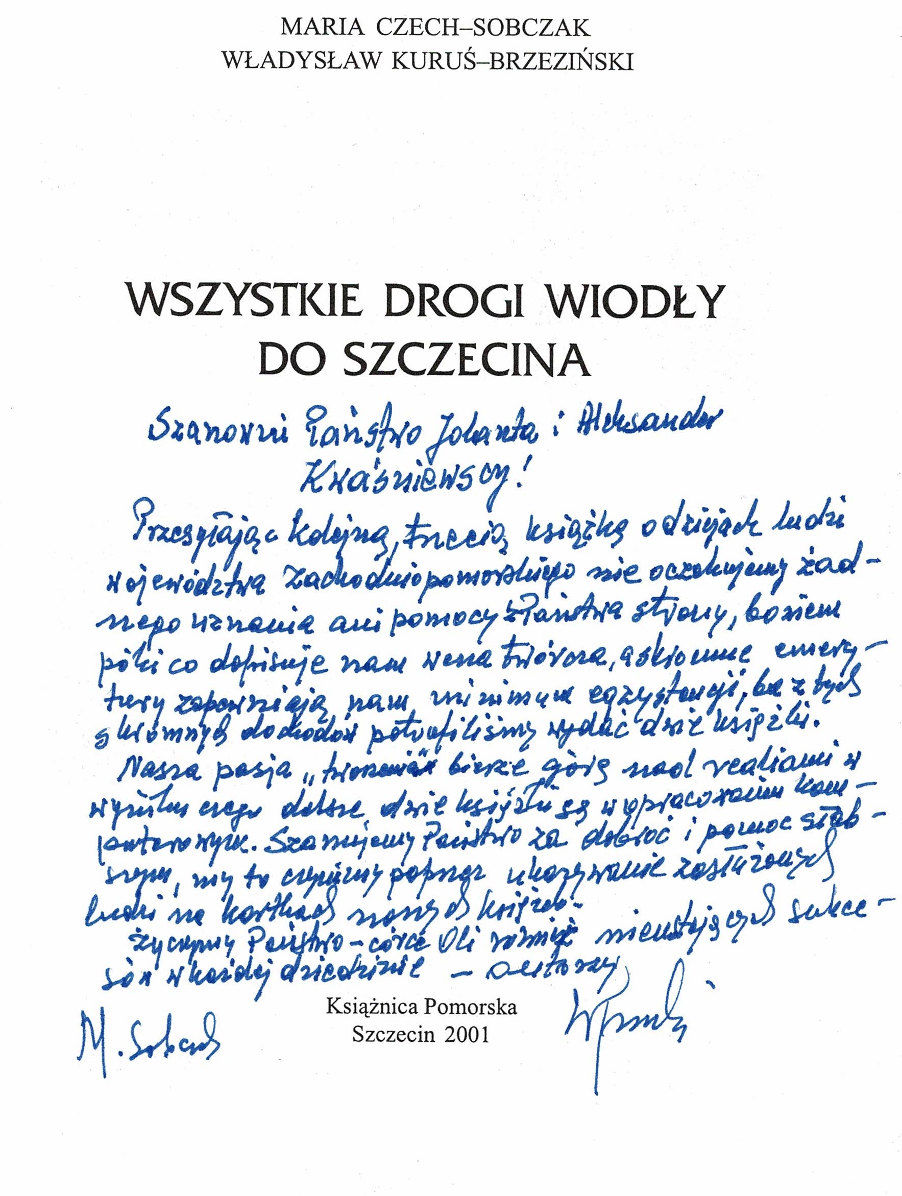 Treść dedykacji: Szanowni Państwo Jolanta i Aleksander Kwaśniewscy! Przesyłając kolejną trzecią książkę o dziejach ludzi województwa zachodniopomorskiego nie oczekujemy żadnego uznania ani pomocy Państrwa sławy, bowiem póki co obfituje nam wena twórcza...