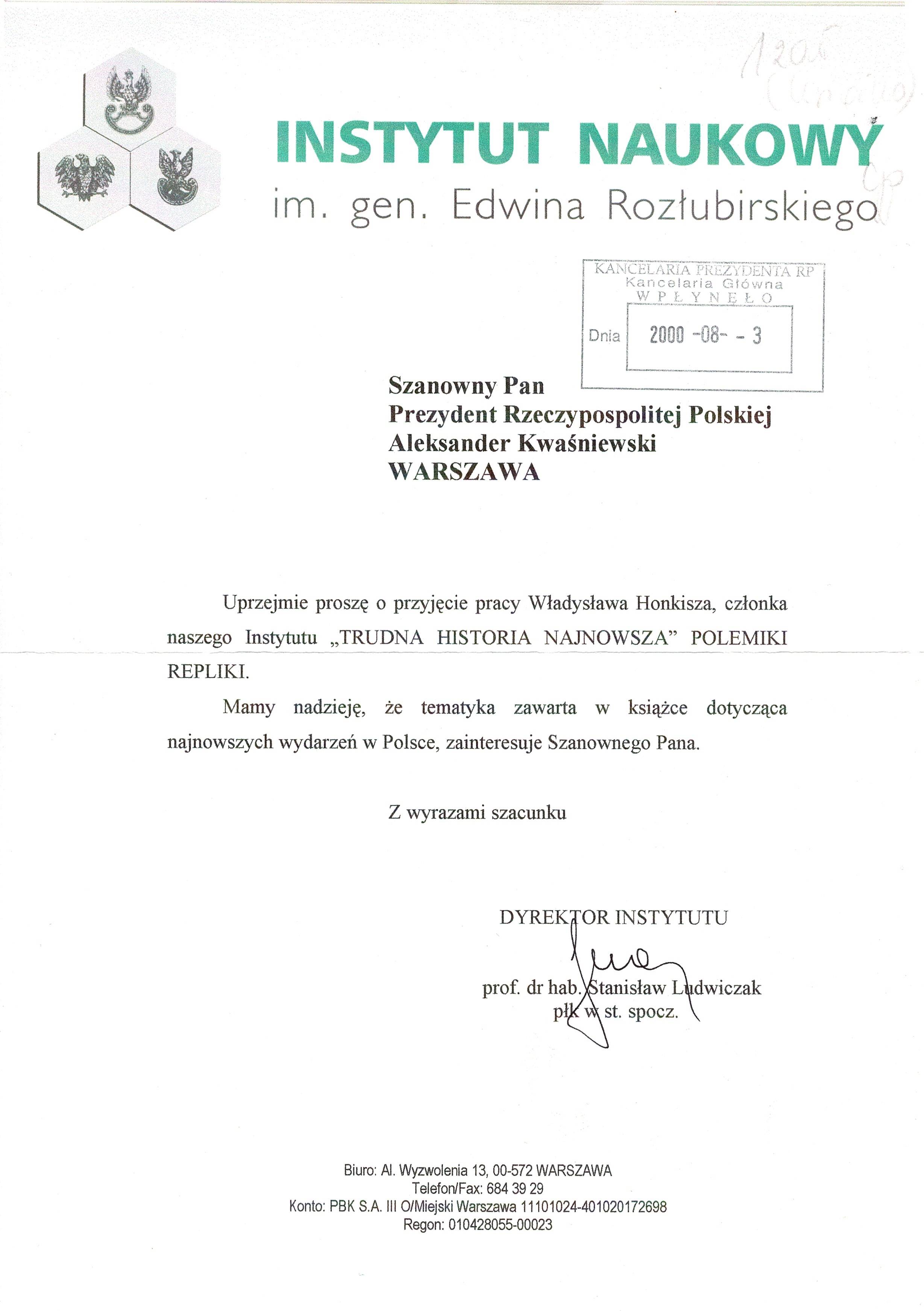 Treść dedykacji: Uprzejmie proszę o przyjęcie pracy Władysława Honkisza, członka naszego Instytutu "Trudna Historia Najnowsza" Polemiki Repliki. Mamy nadzieję, że tematyka zawarta w książce dotycząca najnowszych wydarzeń w Polsce, zainteresuje Szanownego Pana. Z wyrazami szacunku Dyrektor Instytutu prof. dr hab. Stanisław Ludwiczak płk w st. spocz.