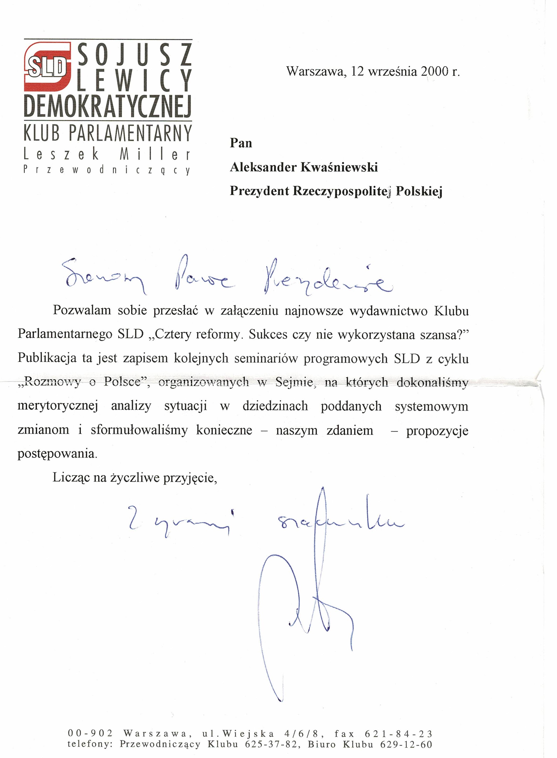 Materiały ze spotkań Klubu Parlamentarnego SLD w 2000 r.