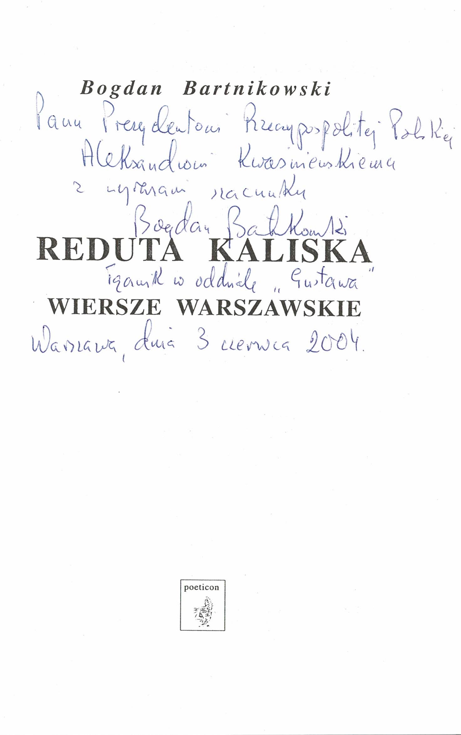 Treść dedykacji: Panu Prezydentowi Rzeczypospolitej Polskiej Aleksandrowi Kwaśniewskiemu z wyrazami szacunku Bogdan Bartnikowski