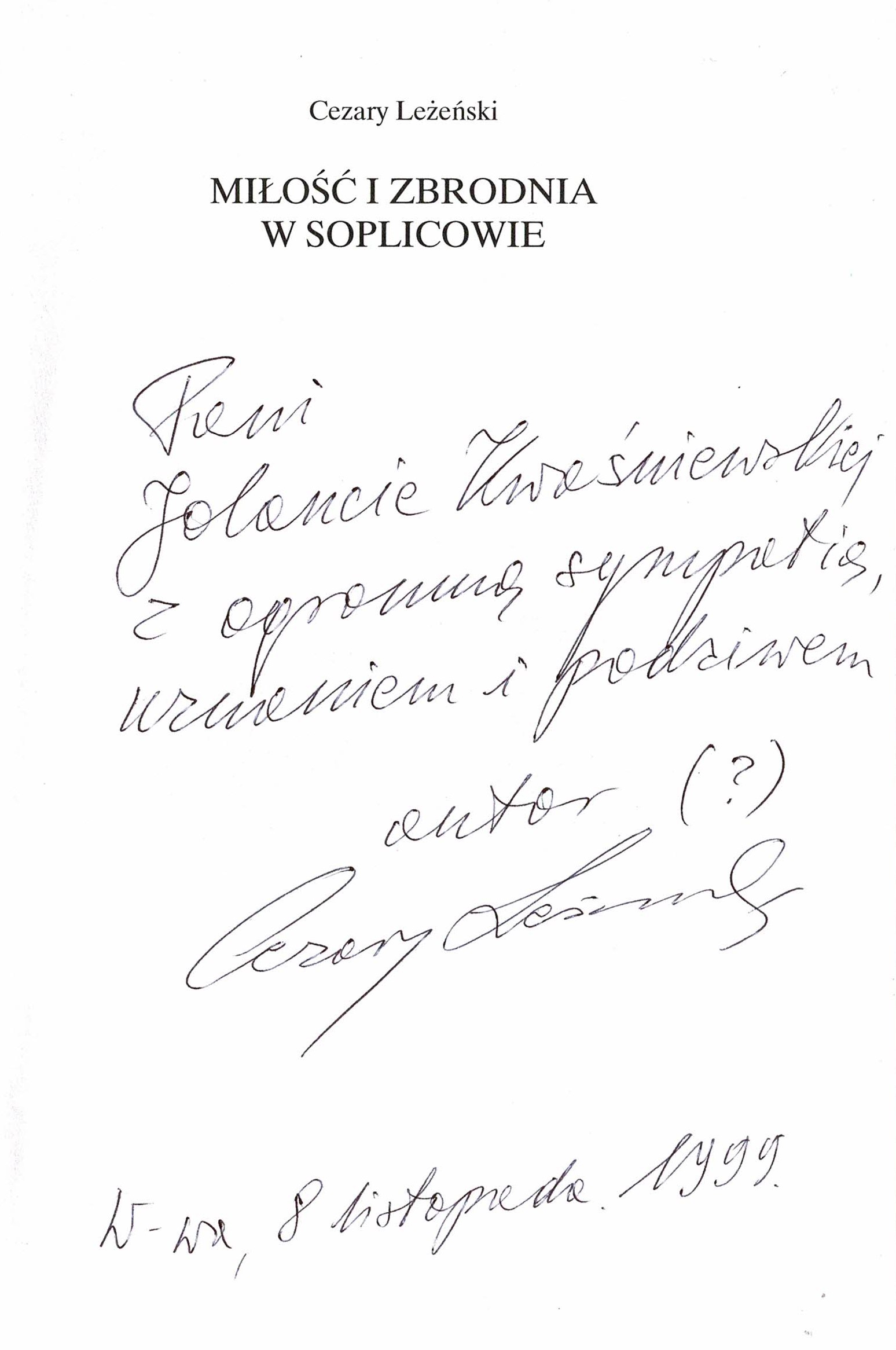 Treść dedykacji: Pani Jolancie Kwaśniewskiej z ogromną sympatią, uznaniem i podziwem autor Cezary Leżeński