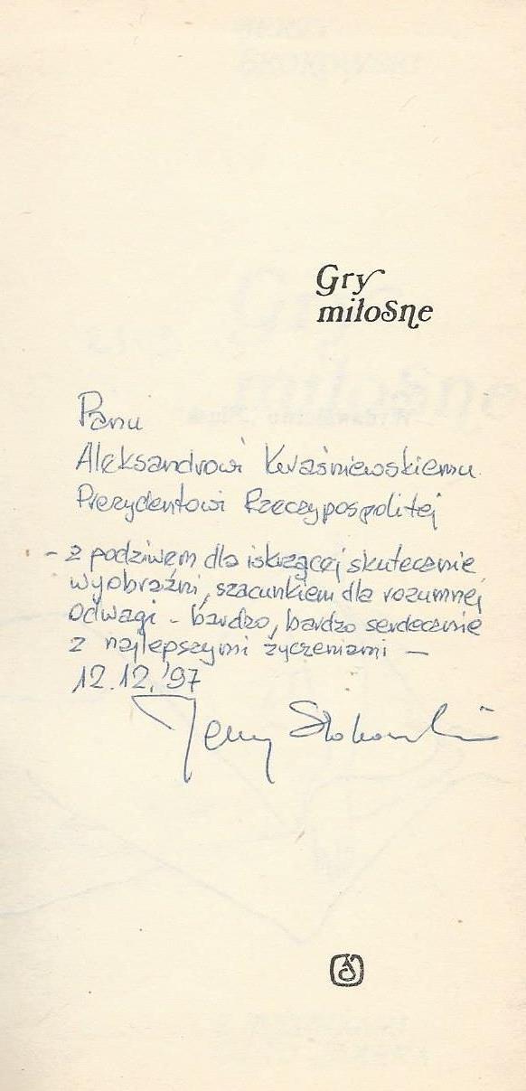 Treść dedykacji: Panu Prezydentowi Aleksandrowi Kwaśniewskiemu Prezydentowi Rzeczypospolitej - z podziwem dla iskrzącej skutecznie wyobraźni , szacunku dla rozumunej odwagi - bardzo, bardzo serdecznie z najlepszymi życzeniami - 12.12.'97 Jezy Skokowski