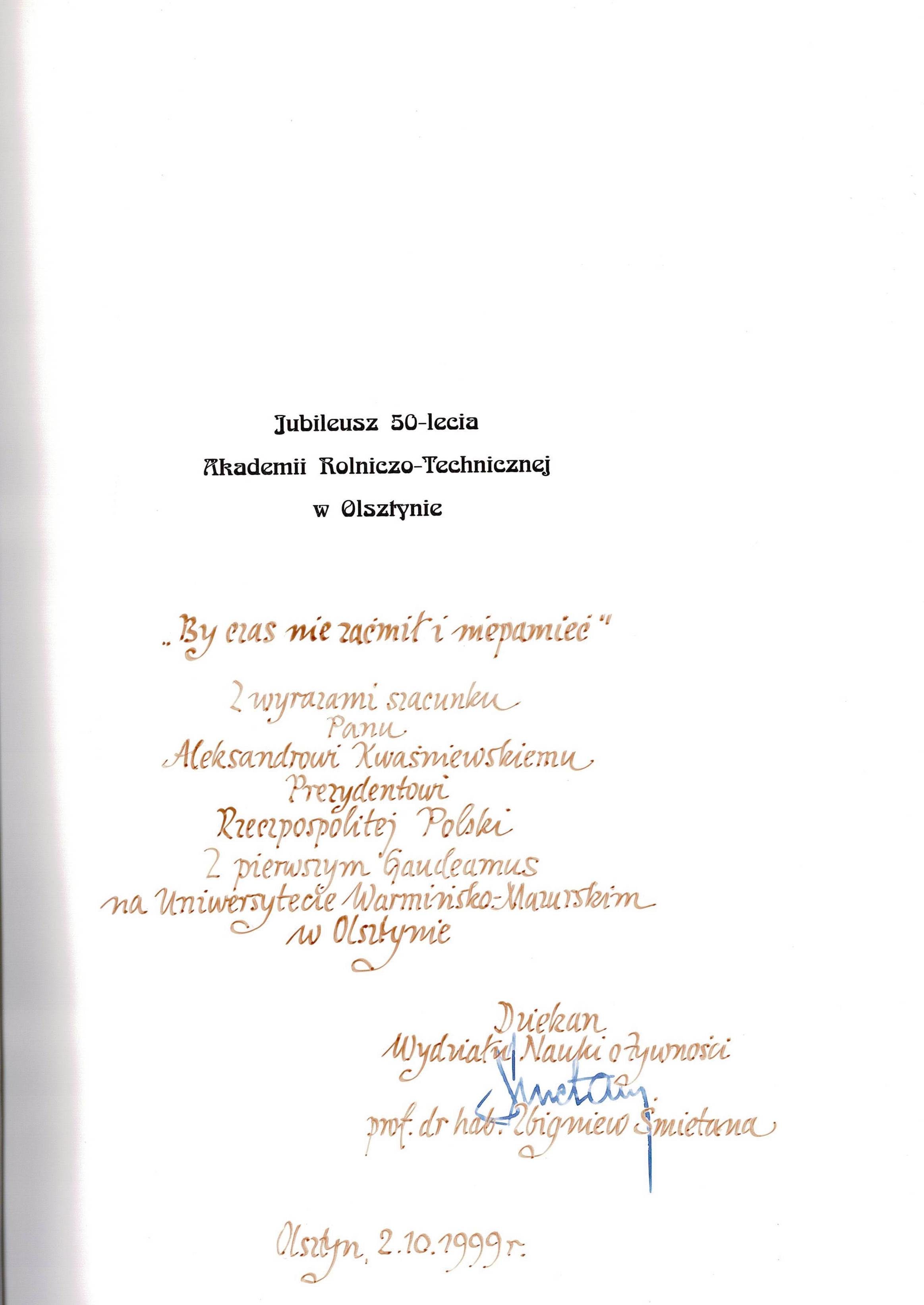 Treść dedykacji: Panu Aleksandrowi Kwaśniewskiemu Prezydentowi Rzeczypospolitej Polskiej z prośbą o przyjęcie i wyrazami szacunku Prezes prof. Janusz Guziur Wiceprezes prof. zw. Andrzej Faruga Członek Zarządu prof. Marian Kozłowski Senator RP Olsztyn, wrzesień 2004 r.