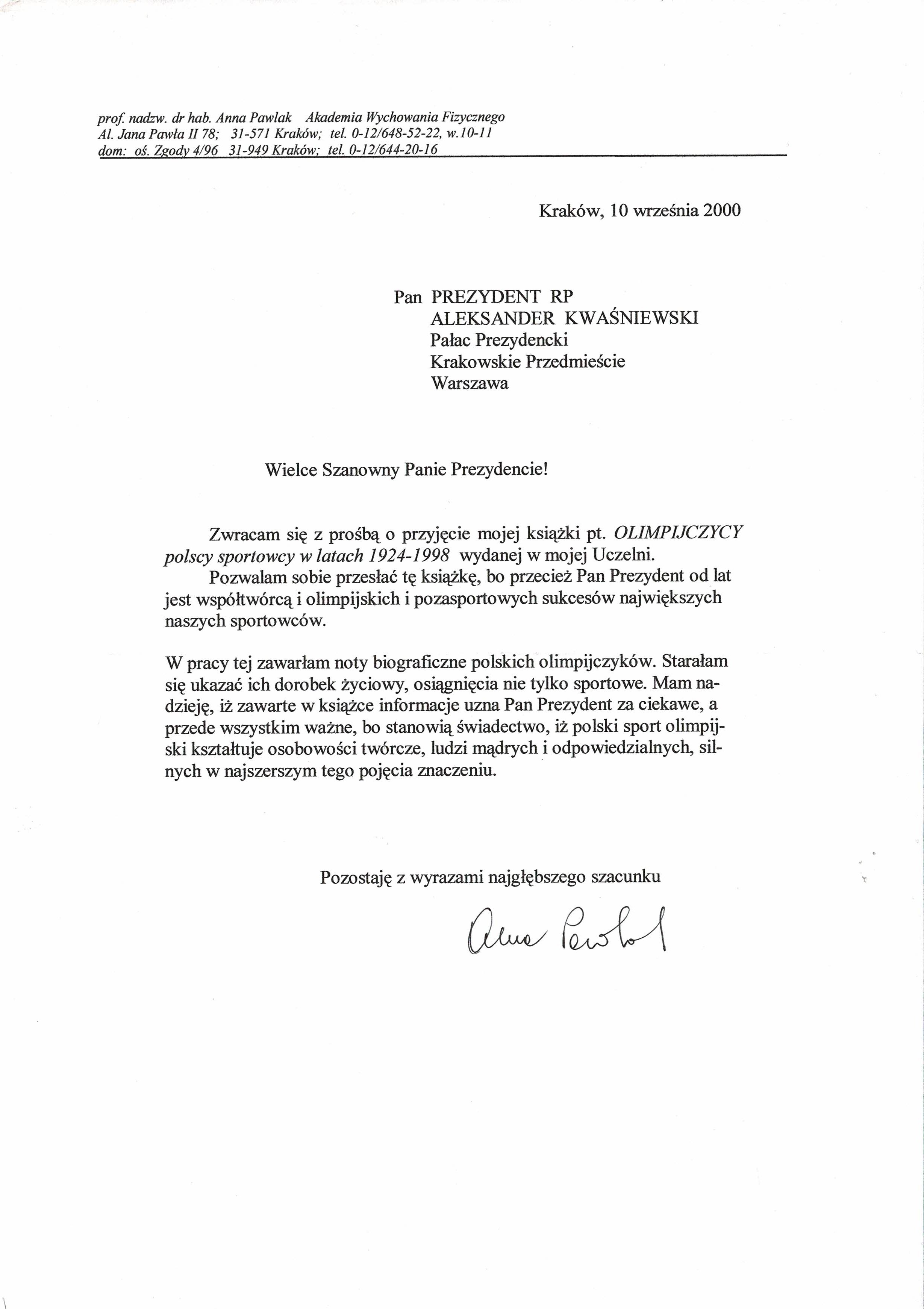 Treść dedykacji: Wielce Szanowny Panie Prezydencie! Zwracam się z prośbą o przyjęcie mojej książki pt. OLIMPIJCZYCY polscy sportowcy w latach 1924 - 1998 wydanej w mojej Uczelni. Pozwalam sobie przesłać tę książkę, bo przecież Pan Prezydent od lat jest współtwórcą i olimpijskich i pozasportowych sukcesów największych naszych sportowców. W pracy tej zawarłam noty biograficzne polskich olimpijczyków. Starałam się ukazać ich dorobek życiowy, osiągnięcia nie tylko sportowe. Mam madzieję, iż zawarte w książce informacje izna Pan Preztdent za ciekawe, a przede wszystkim ważne, bo stanowią świadectwo, iż polski sport olimpijski kształtuje osobowości twórcze, ludzi mądrych i odpowiedzialnych, silnych w najszerszym tego pojęcia znaczeniu. Pozostaję z wyrazami głębokiego szacunku Anna Pawlak