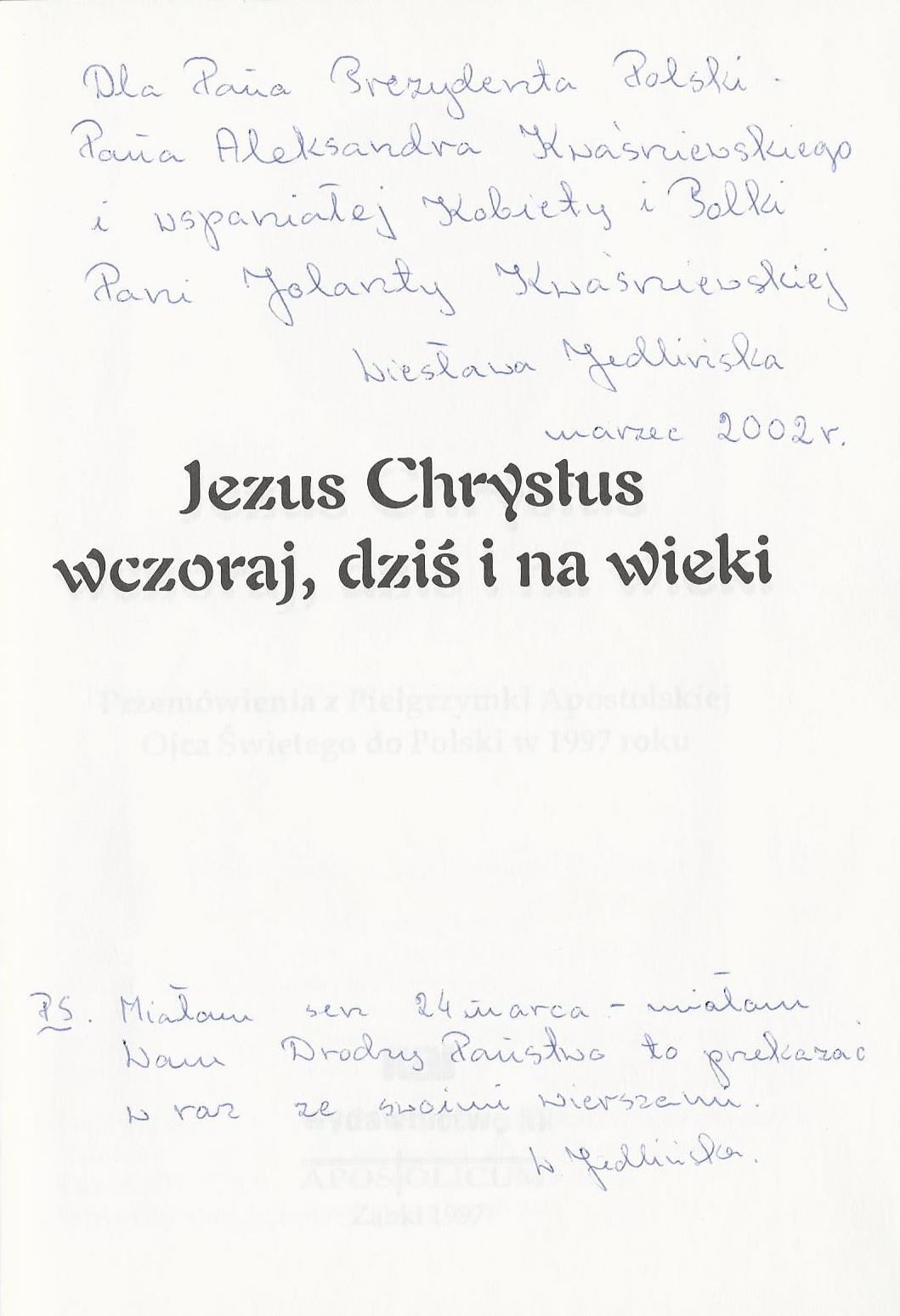 Treść dedykacji: Dla Pana Prezydenta Polski Pana Aleksandra Kwaśniewskiego i wspaniałej Kobiety i Polki Pani Jolanty Kwaśniewskiej- Wiesława Jedlińska,marzec 2002. P.S. Miałam sen 24 marca i miałam Wam Drodzy Państwo to przekazać w raz ze swoimi wierszami. W. Jedlińska