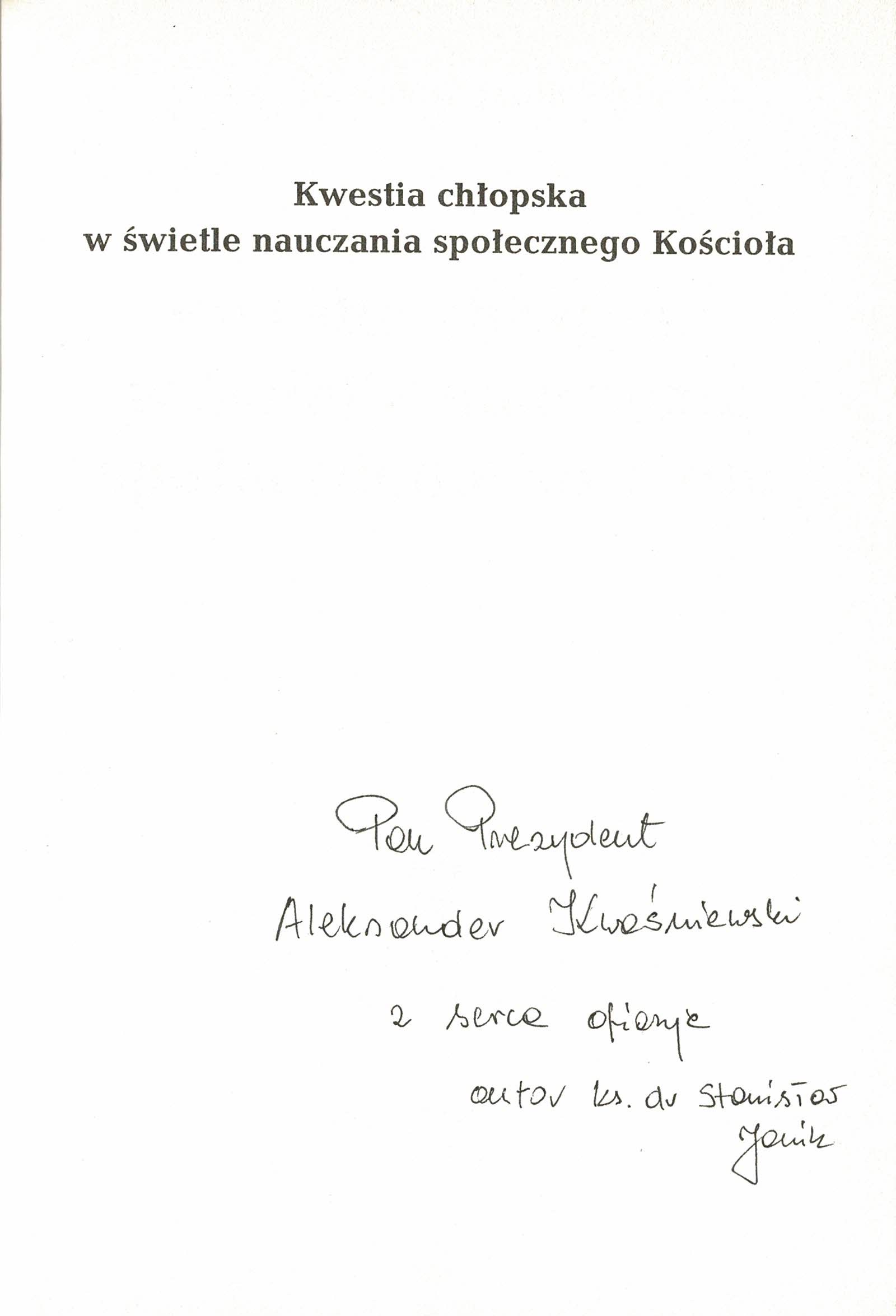 Treść dedykacji: Pan Prezydent Aleksander Kwaśniewski z serca ofiaruje autor ks. dr. Stanisław Janik