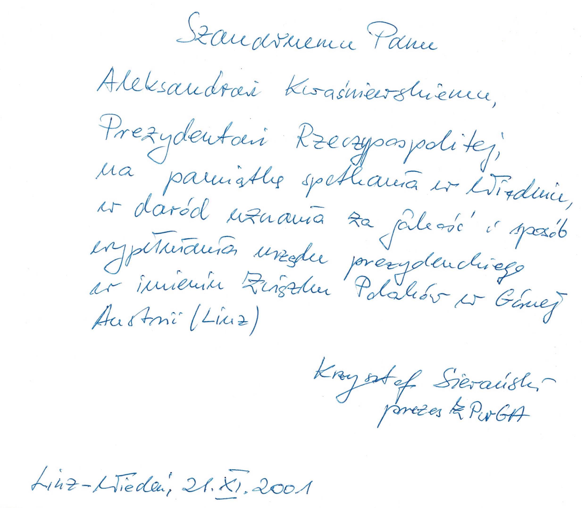 Treść dedykacji: Szanownemu Panu Aleksandrowi Kwaśniewskiemu, Prezydentowi Rzeczypospilitej, na pamiątkę spotkania w Wiedniu, w dowód uznania za jakość i sposób urzędu prezydenckiego w imieniu Związku Polaków w Górnej Austrii