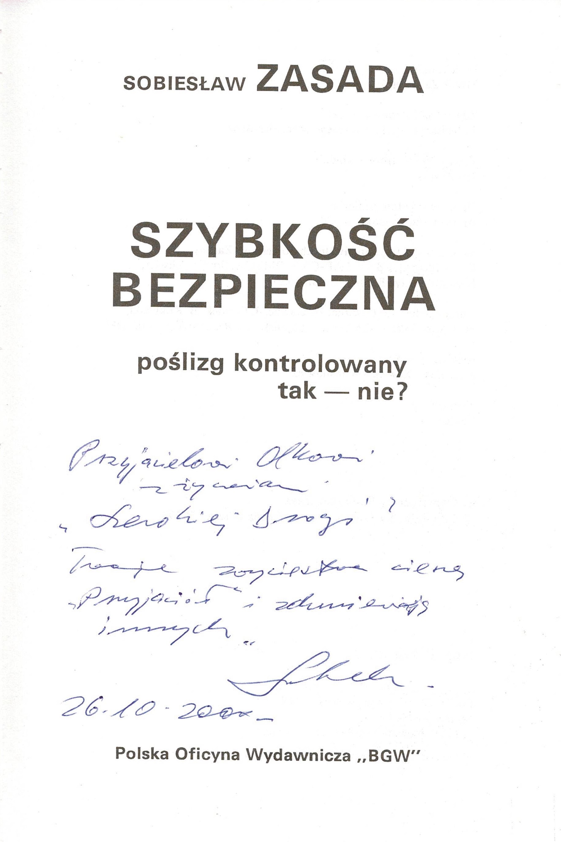 Przyjacielowi Olkowi z życzeniami "Szerokiej Drogi". Twoje zwycięstwa cieszą "przyjaciół" i zdumiewają innych, S. Zasada. 26.10.2000 r.