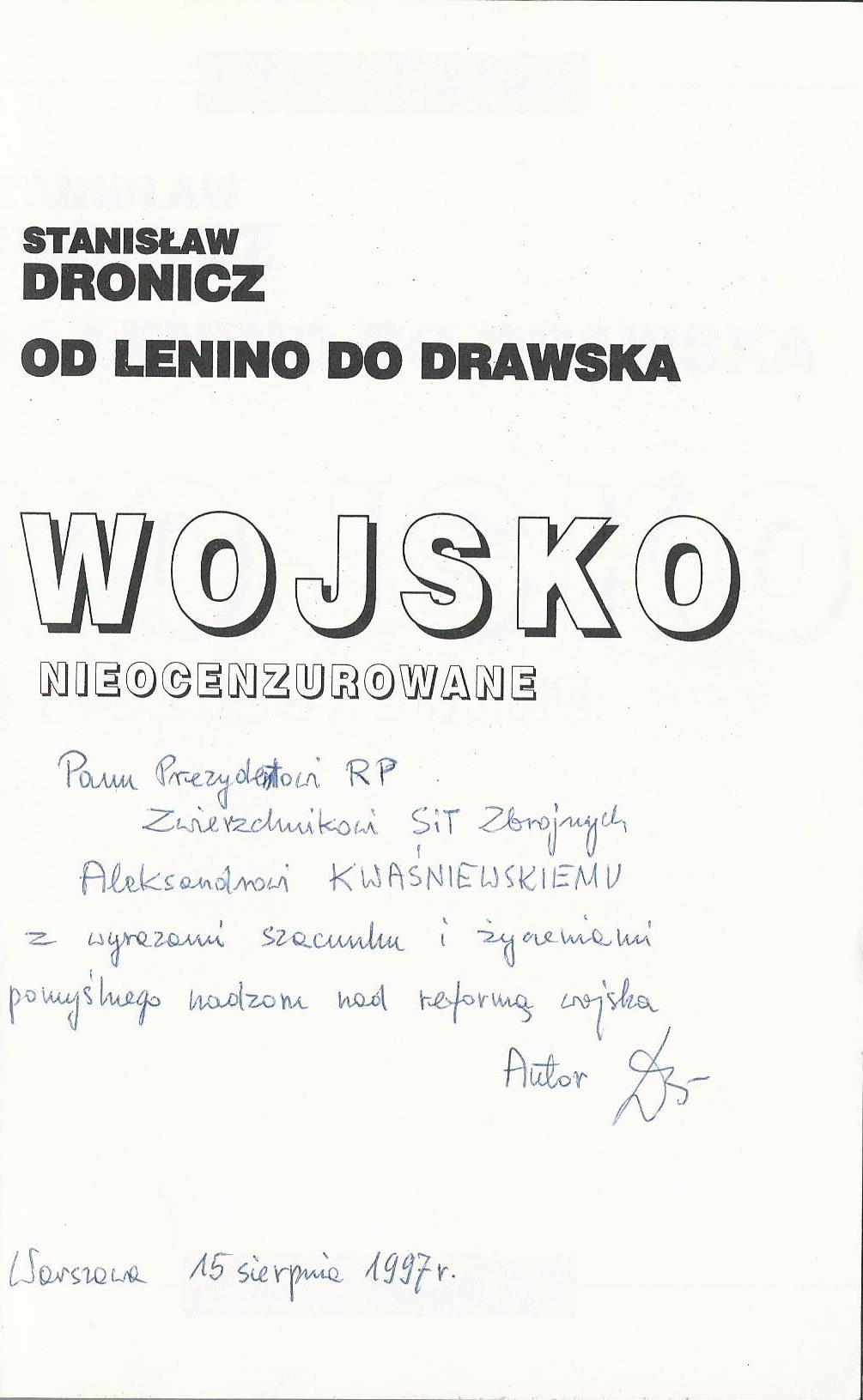 Treść dedykacji: Panu Prezydentowi RP Zwierzchnikowi Sił Zbrojnych Aleksandrowi KWAŚNIEWSKIEMU z wyrazami szacunku i życzeniami pomyślnego nadzoru nad reformą wojska Autor Warszawa 15 sierpnia 1997r.