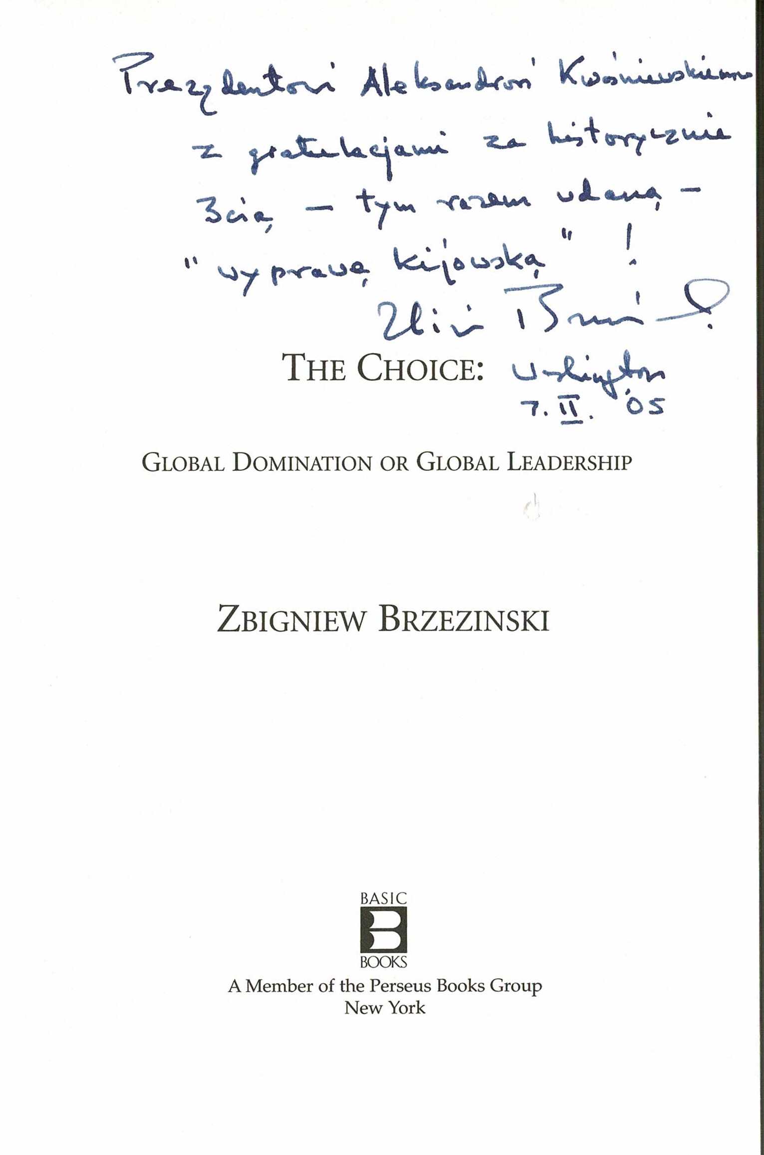 Treść dedykacji: Prezydentowi Aleksandrowi Kwaśniewskiemu z gratulacjami za historyczną - trzecią - tym razem udaną "wyprawę Kijowską" - Zbigniew Brzeziński