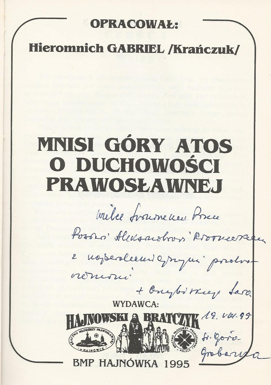 Treść dedykacji: Wielce Szanownemu Panu Posłowi Aleksandrowi Kwaśniewskiemu z najserdeczniejszymi pozdrowieniami 19. VIII. 99 Św. Góra Atos