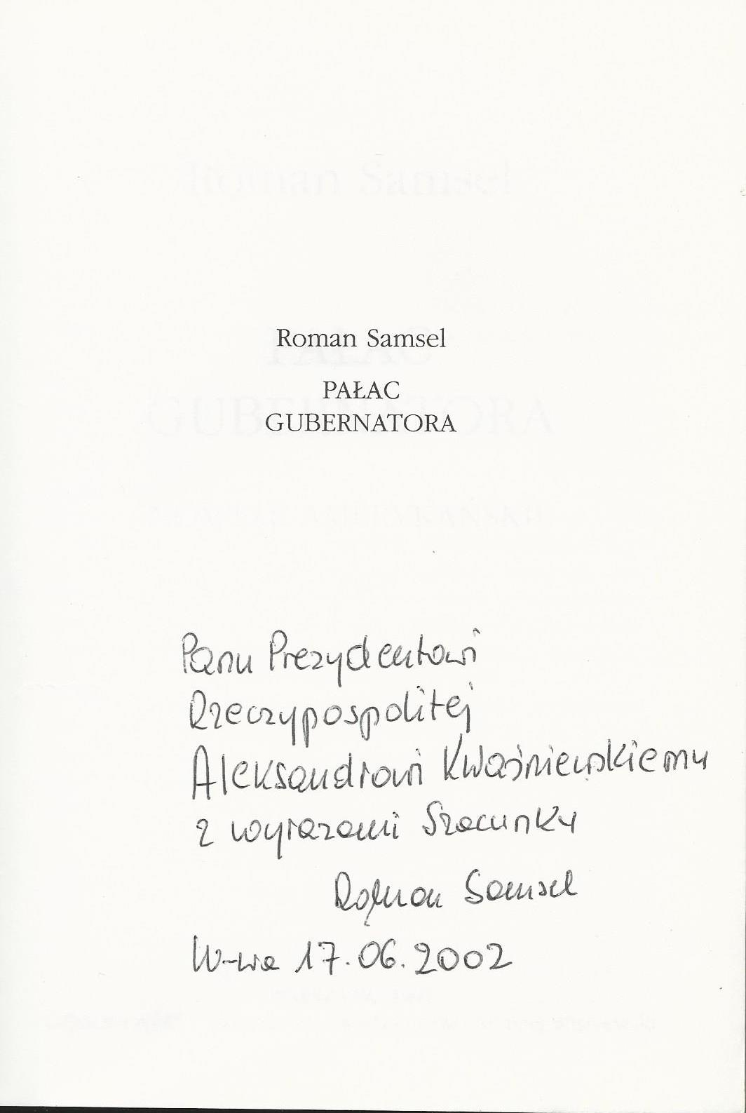 Panu Prezydentowi Rzeczypospolitej Aleksandrowi Kwasniewskiemu z wyrazami szacunku Roman Samsel W-wa 17.06.2002