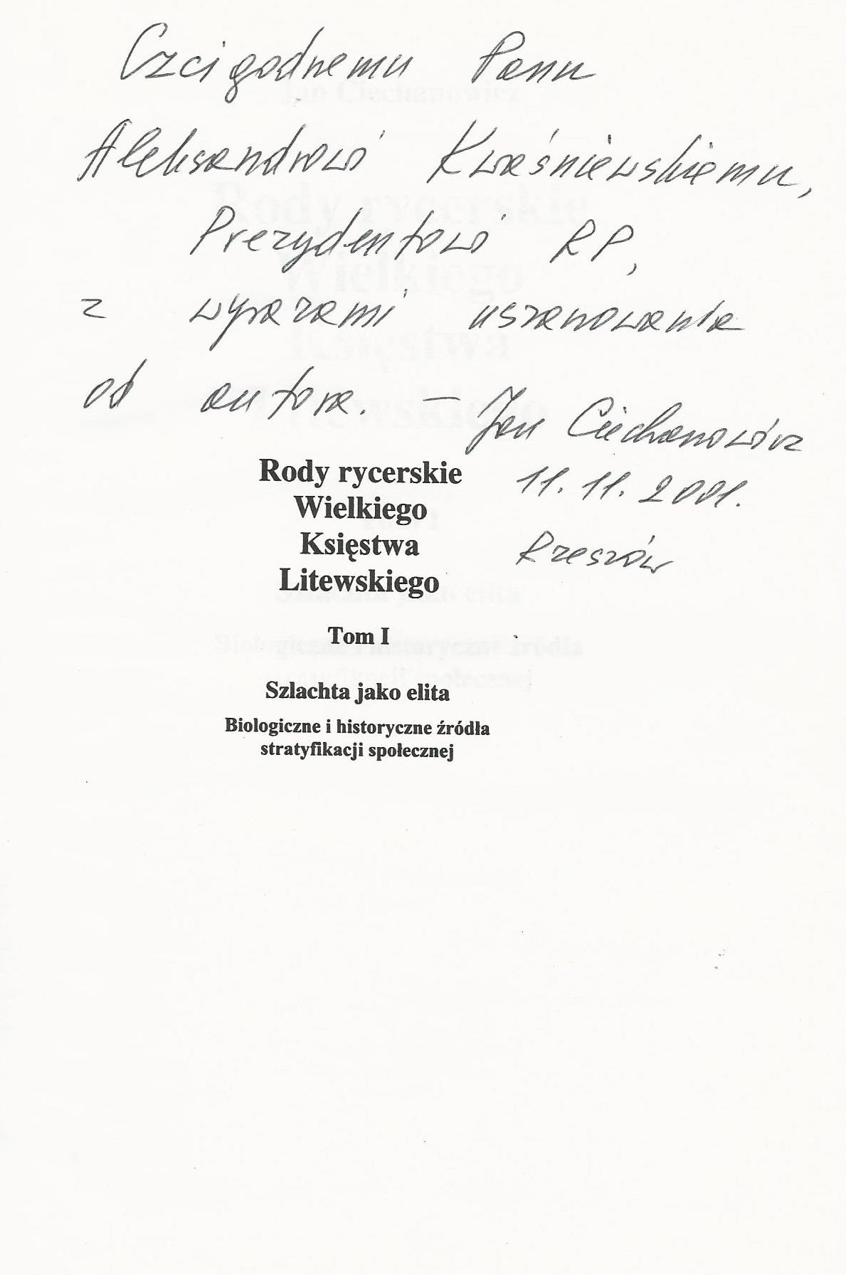 Treść dedykacji: Czcigodnemu Panu Aleksandrowi Kwaśniewskiemu Prezydentowi RP, z wyrazami uszanowania od autora.- Jan Ciechanowicz 11.11.2001. Rzeszów