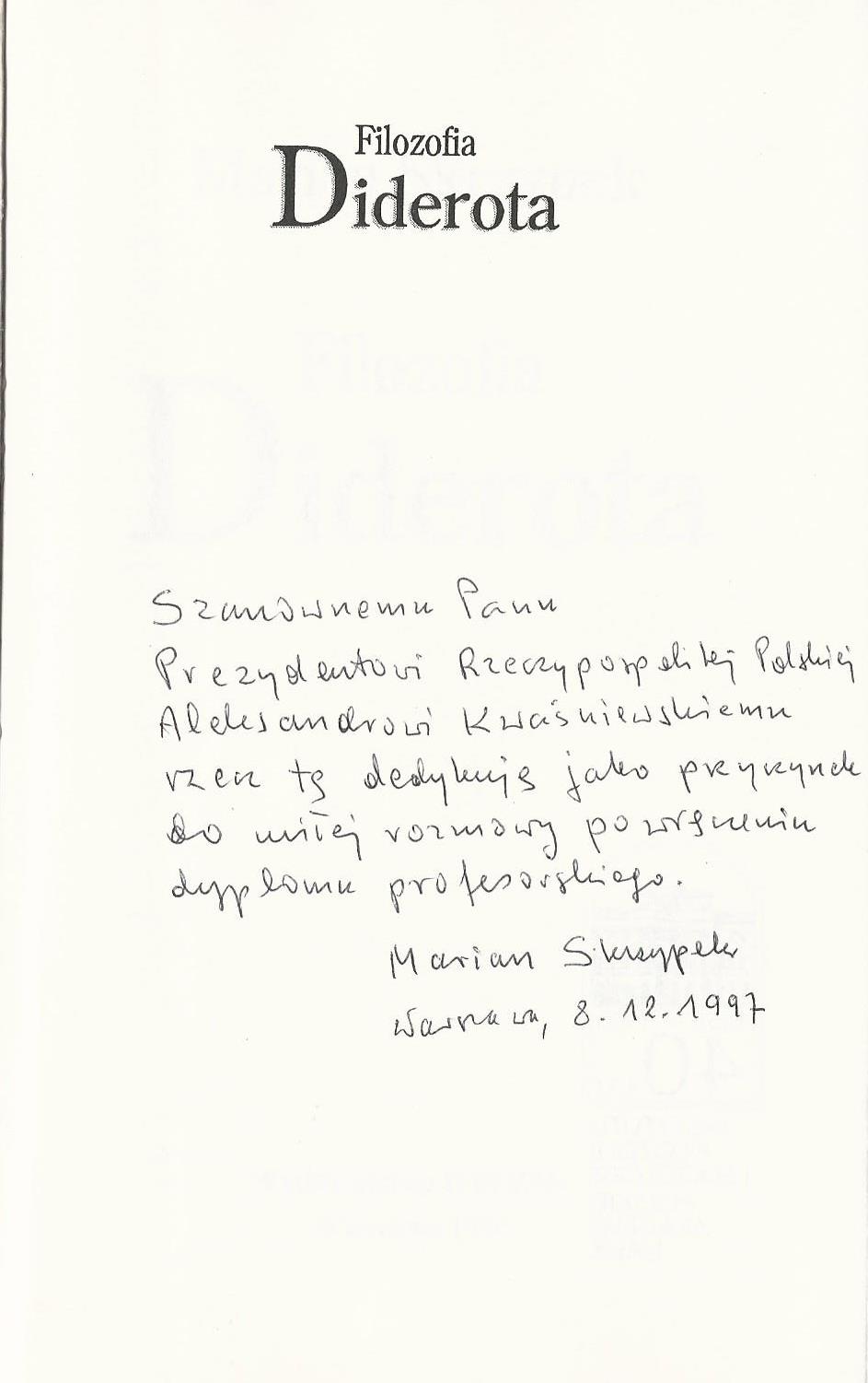 Szanownemu Panu Prezydentowi Rzeczypospolitej Polskiej Aleksandrowi Kwasniewskiemu rzecz tę dedykuję jako przyczynek do miłej rozmowy po wręczeniu dyplomu profesorskiego. Marian Skrzypek Warszawa,8.12.1997