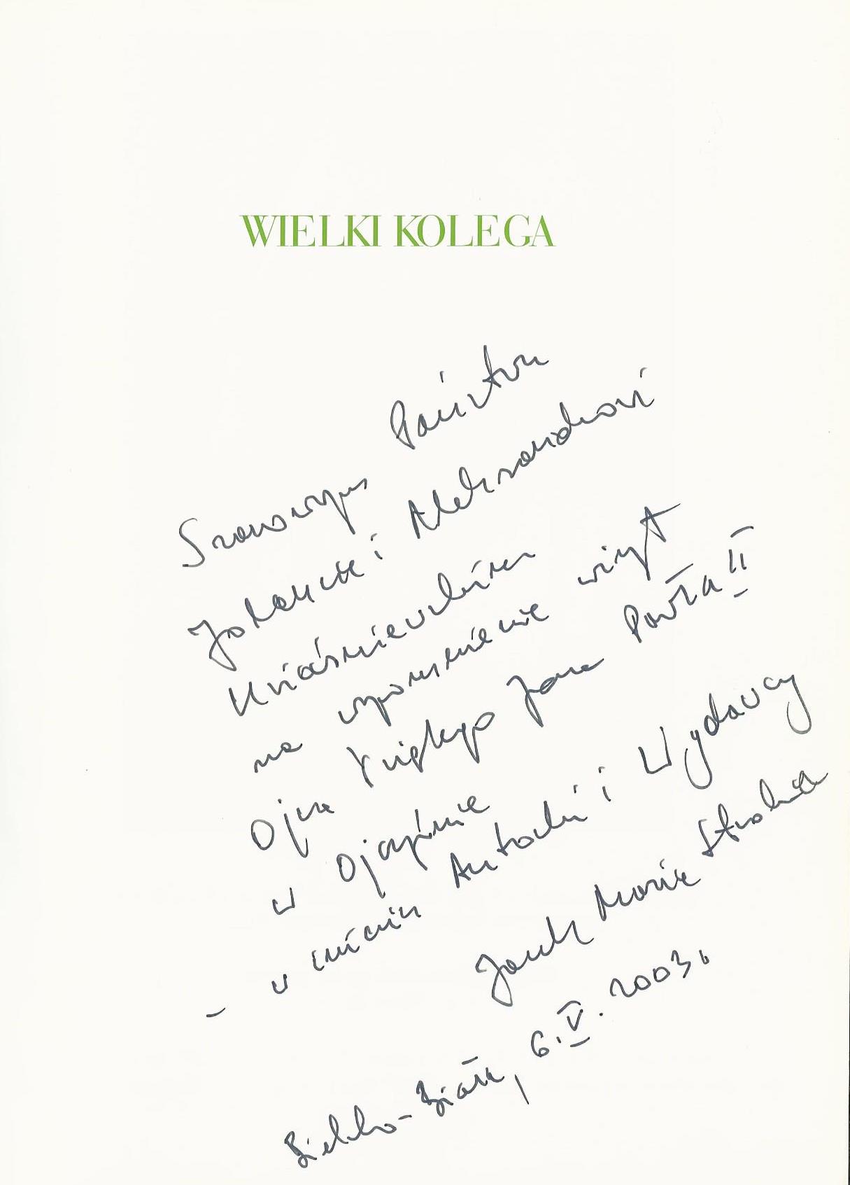 Treść dcedykacji: Szanownym Państwu Jolancie i Aleksandrowi Kwasniewskim na upamiętnienie wizyt Ojca Świętego Jana Pałwa II w Ojczyźnie - w iminieu Autorki i Wydawcy (część dedykacj nie czytelna) Bieblsko -Biała,6.V.2003 r.