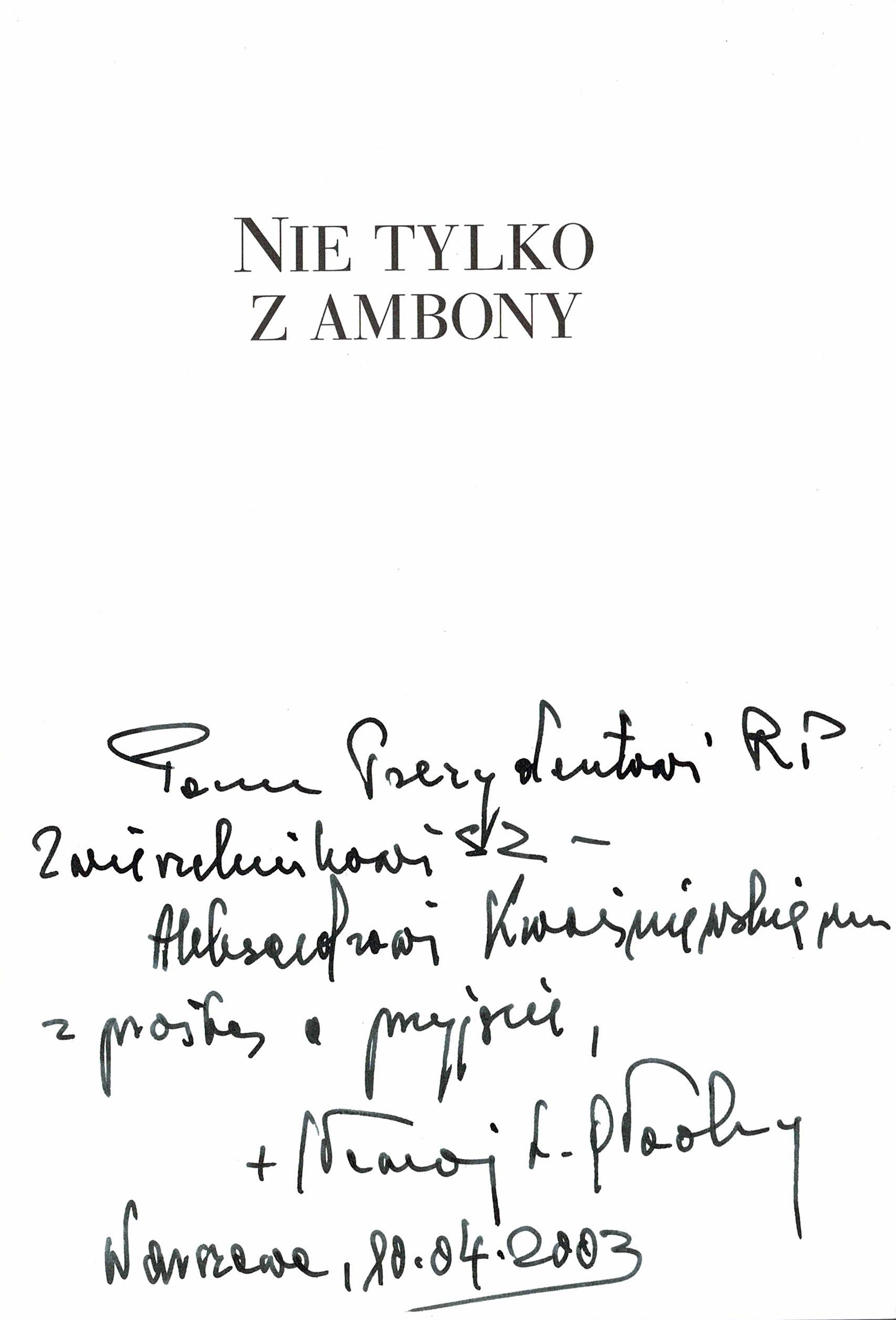 Treść dedykacji: Panu Prezydentowi RP Zwierzchnikowi - Aleksandrowi Kwaśniewskiemu z prośbą o przyjęcie