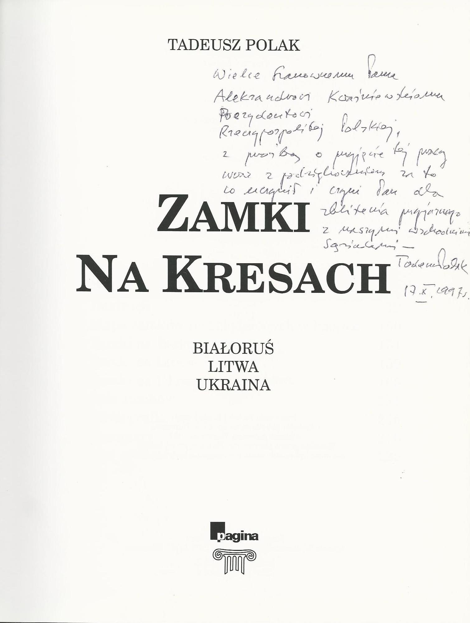 Treść dedykacji: Wielce Szanownemu Panu Aleksandrowi Kwasniewskiemu Prezydentowi Rzeczypospolitej POlskiej, z prośbą o przyjęcie tej pracy wraz z podziękowaniem za to co uczynił i czyni dla zliżenia ojczyzny z naszymi wschodnimi sąsiadami 17.X.1997r.