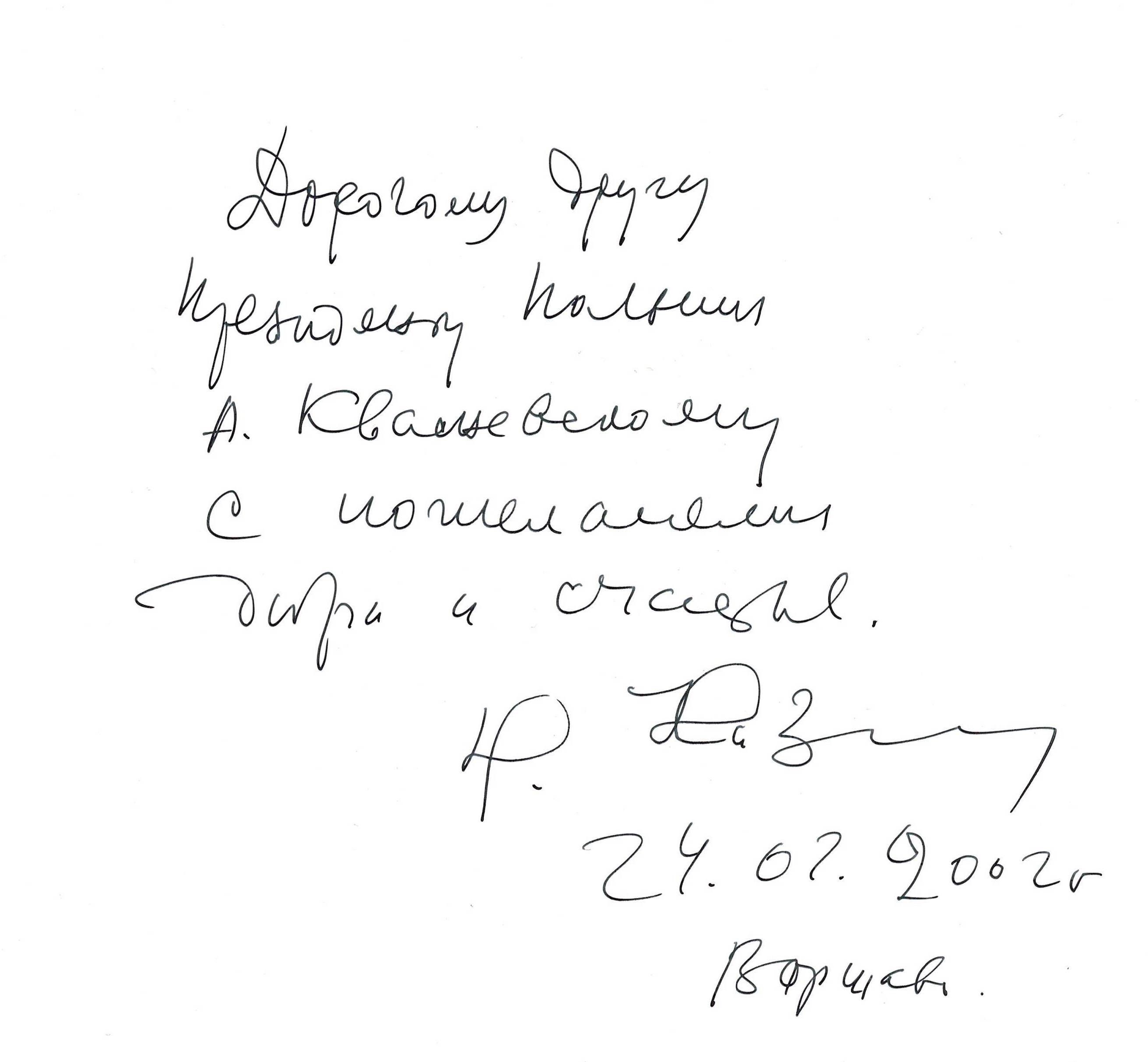 Treść dedykacji: Panu Aleksandrowi Kwaśniewkiemu Prezydentowi Rzeczypospolitej Polskiej na pamiątkę pobytu w Czechach Koło Polskich Kombatantów w RP, Brno, w lutym 2000