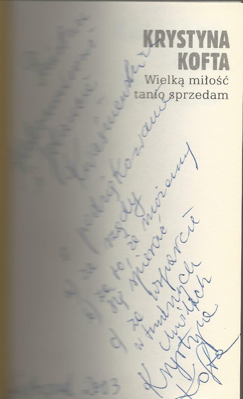 Treść dedykacji: Państwu Aleksandrowi i JOlancie Kwaśniewskim z podziękowaniem a) za rządy b) za to, że możemy się spierać c ) za wsparcie w trudnych chwilach Krystyna Kofta Listopad 2003