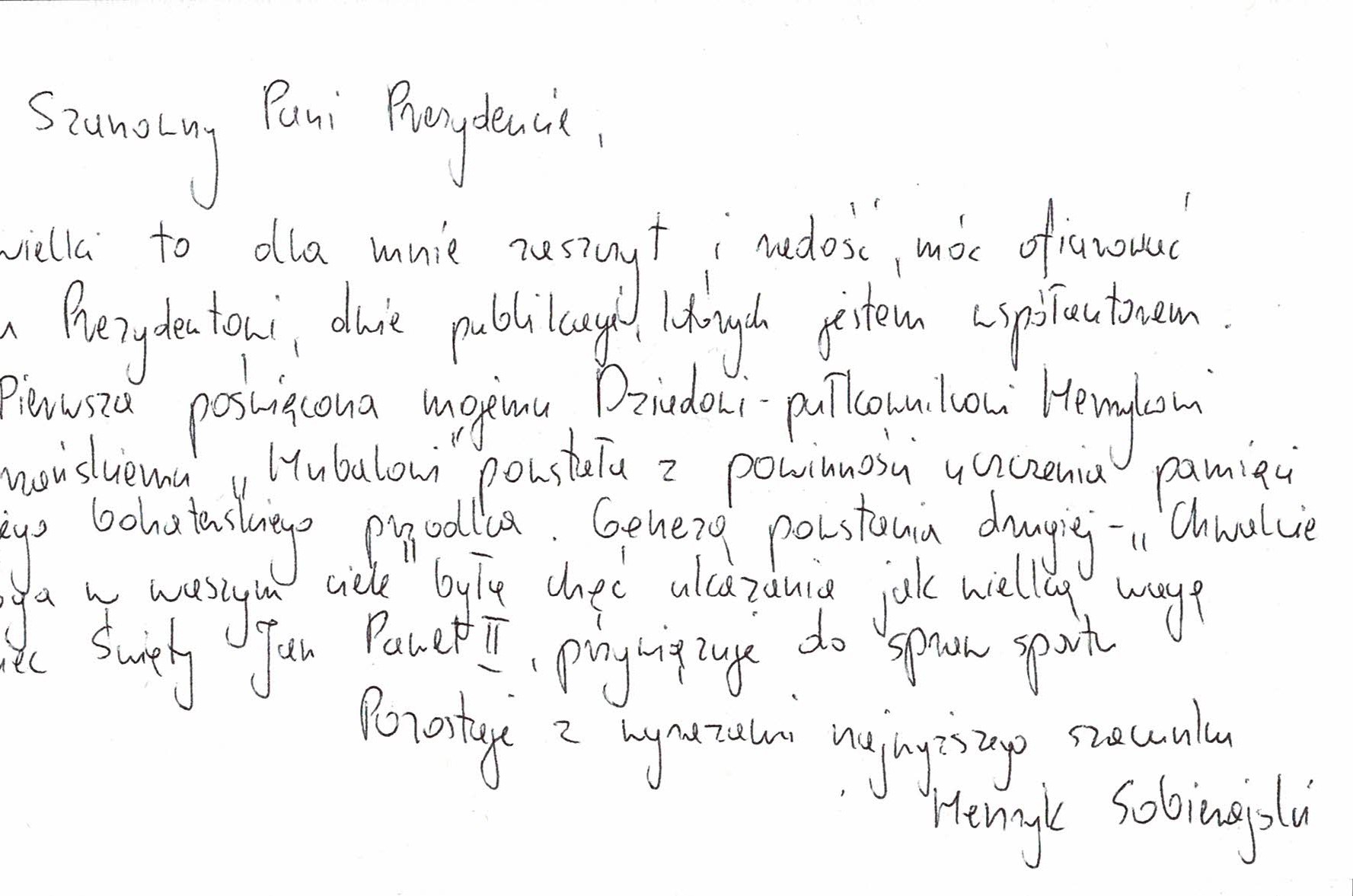 Treść dedykacji: Szanowny Panie Prezydencie Wielki to dla mnie zaszczyt i radość, móc ofiarować Panu Prezydentowi, dwie publikacje, których jestem współautorem. Pierwsza poświęcona mojemu Dziadowi - pułkownikowi Henrykowi Dobrzeńskiemu, powstała z powinności uczczenia pamięci mojego bohaterksiego pradziadka. Genezą powstania drgiej "Chwalcie Boga w waszym ciele : była chęć ukazania jak wielką uwagę Ojciec Święty Jan Paweł II przyywiązuje do spraw sportu. Pozostaje z wyrazami szacunku Henryk Sobierajski