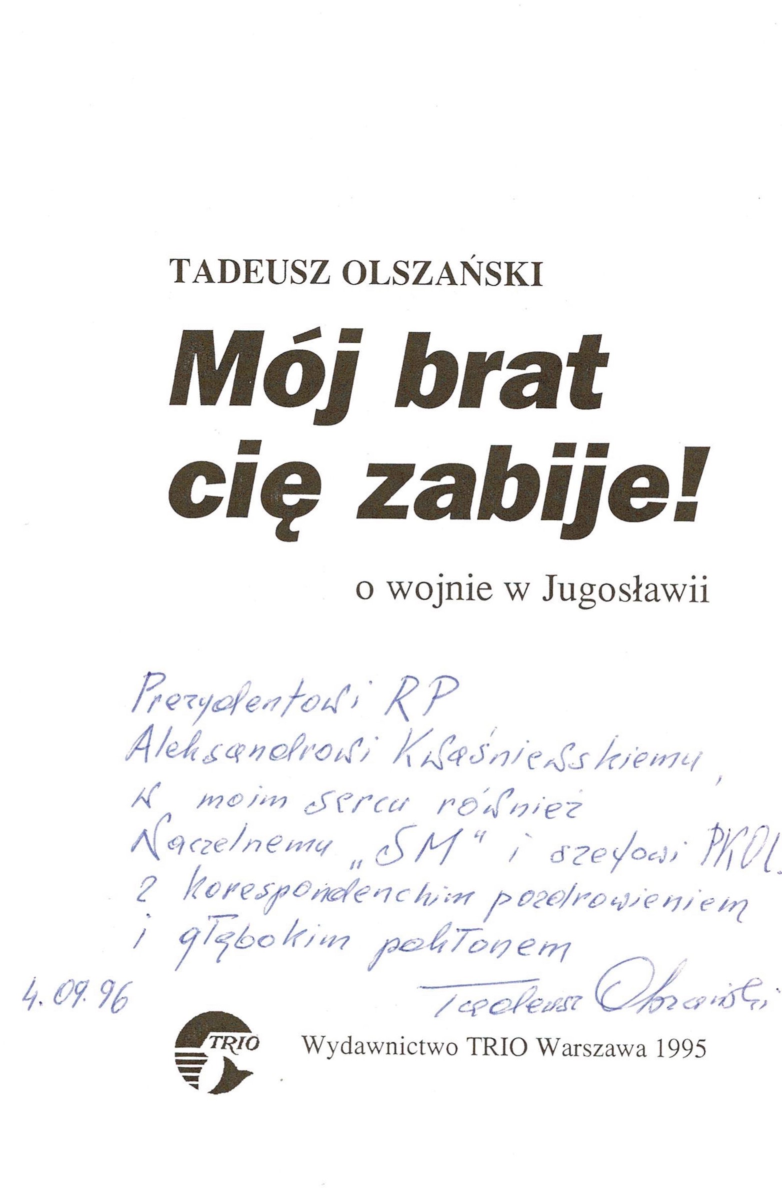 Treść dedykacji: Prezydentowi RP Aleksandrowi Kwaśniewskiemu w moim sercu również Naczelnemu "SM" i szefowi PKOL z korespondenckim pozdrowieniem i głębokim pokłonem Tadeusz Olszański 4.09.96.