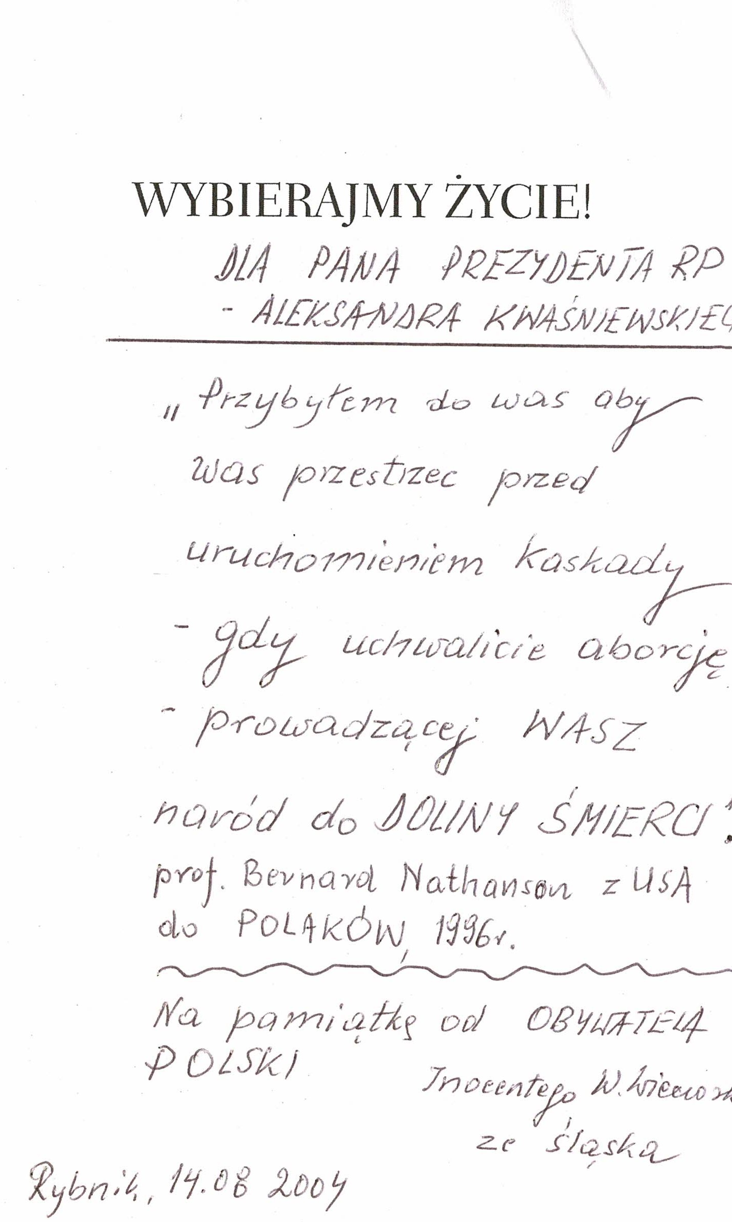 Treść dedykacji: Dla Pana Prezydenta RP - Aleksandra Kwaśniewskiego. "Przybyłem do was aby was przestrzec przed uruchomieniem kaskady - gdy uchwalicie aborcję - prowadzącej przez Wasz naród do Doliny Śmierci"! prof. Bernard Nathanson z USA do Polaków, 1996r. Na pamiątkę od Obywatela Polski
