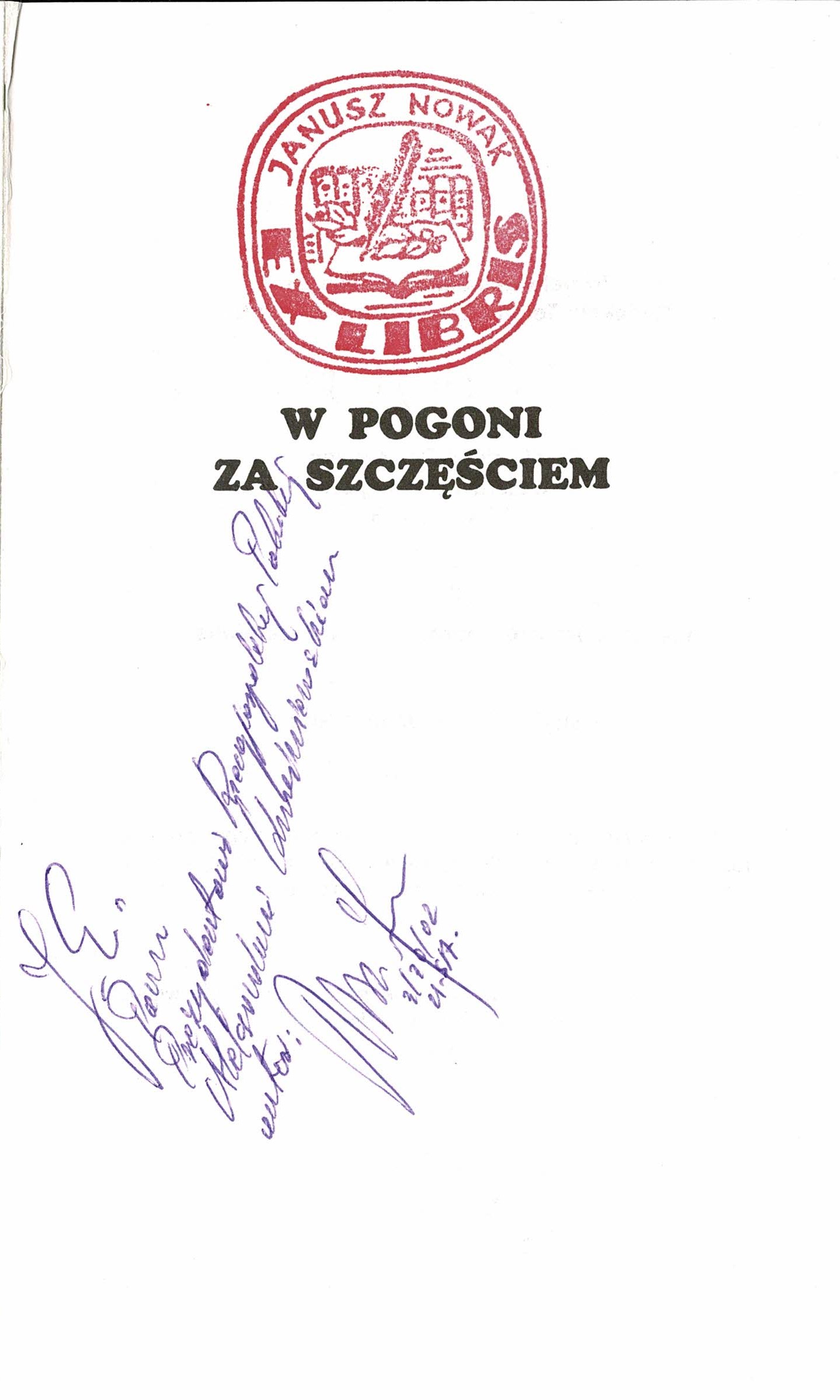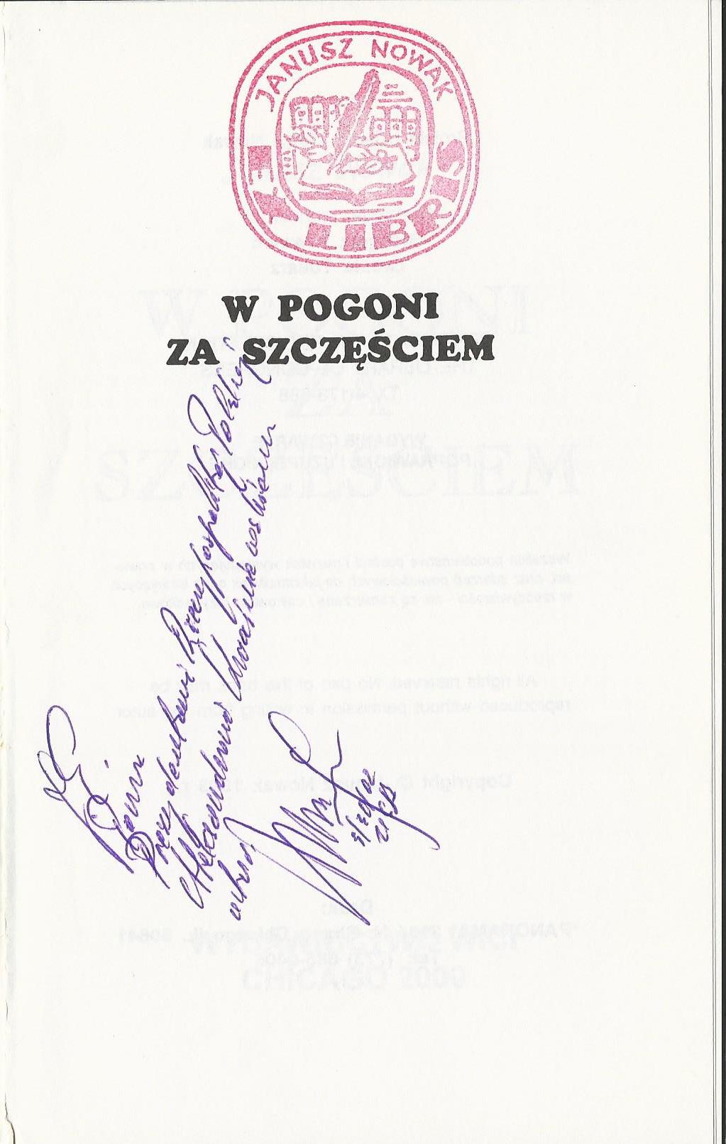 Treść dedykacji: Sz. Panu Prezydentowi Rzeczypospolitej Polskiej Aleksandrowi Kwaśniewskiemu autor: Janusz Nowak 3/30/02 U.S.A.